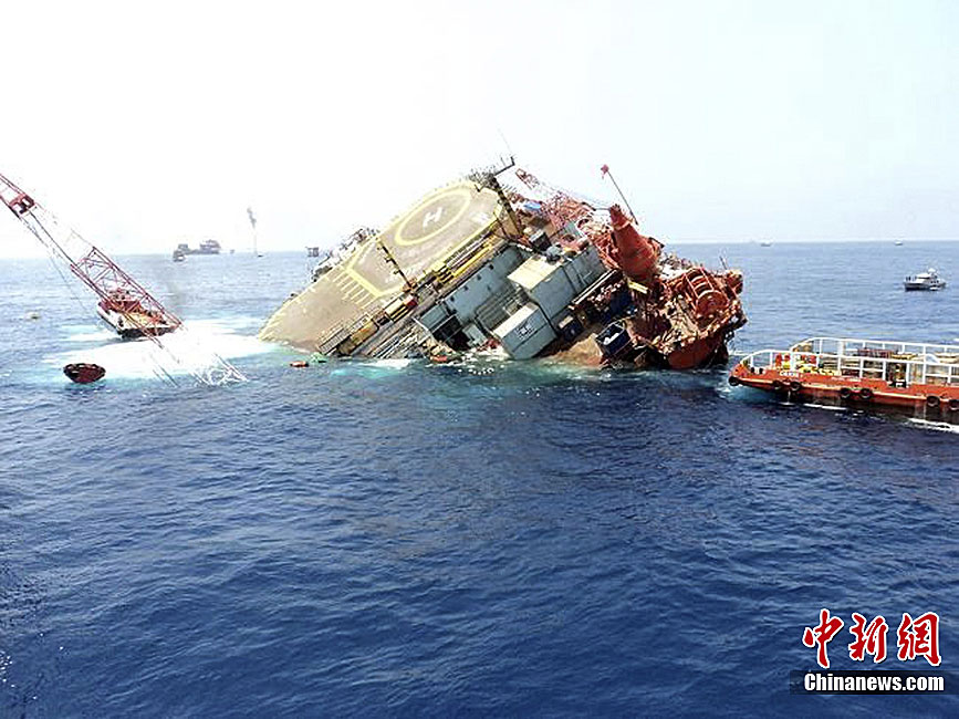 据墨西哥石油公司称,一座位于墨西哥湾隶属于墨西哥石油公司的半潜式海上平台,因发生机械故障而倾斜。目前,除必要的工作人员外,其他人员均已撤离。图为4月12日,该半潜式海上平台部分深入海中。