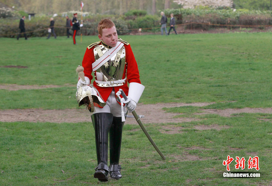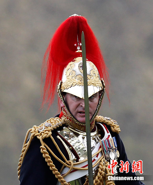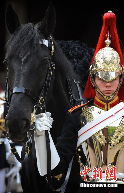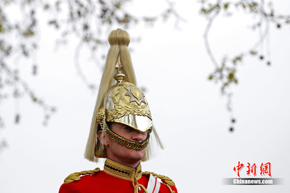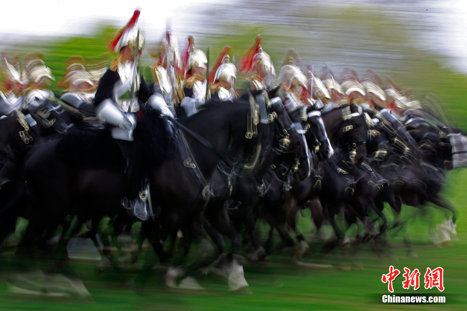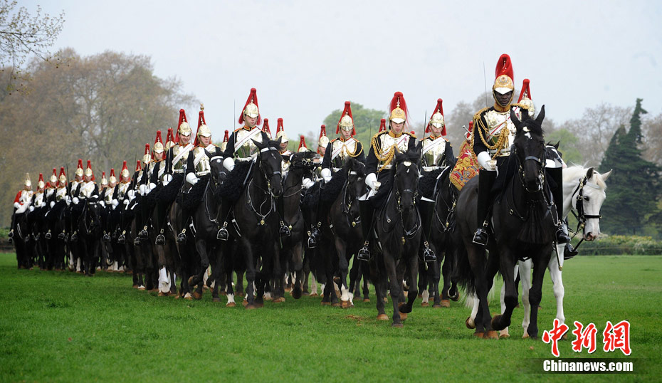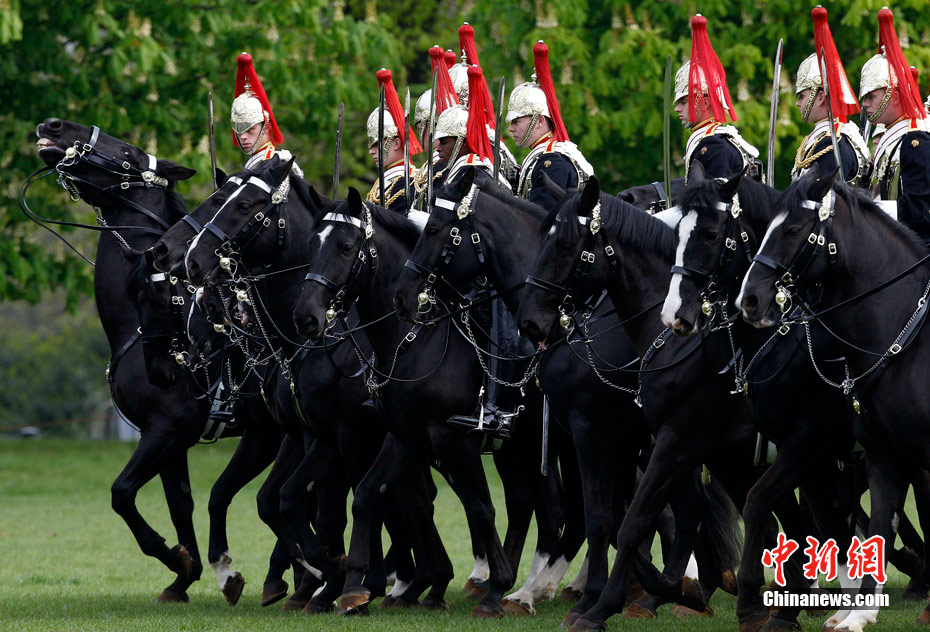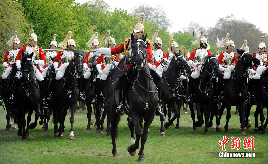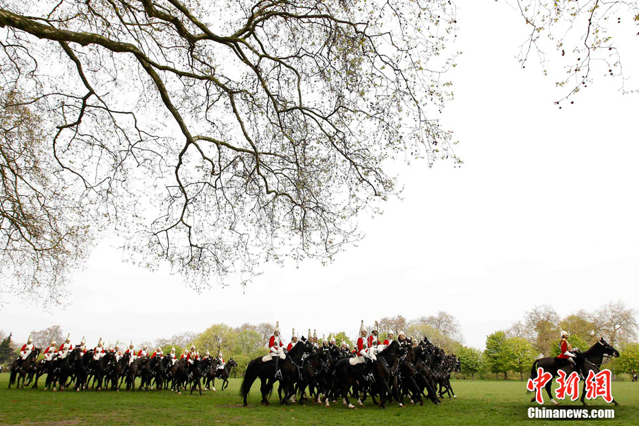 2011年4月14日,英国伦敦海德公园,英国皇家骑兵队在为一周后的阅兵举行演习。皇家骑兵队将在4月21日接受少将的检阅,以求达到重大仪式的仪仗标准,并为4月29日即将到来的王室婚礼做最后的准备。