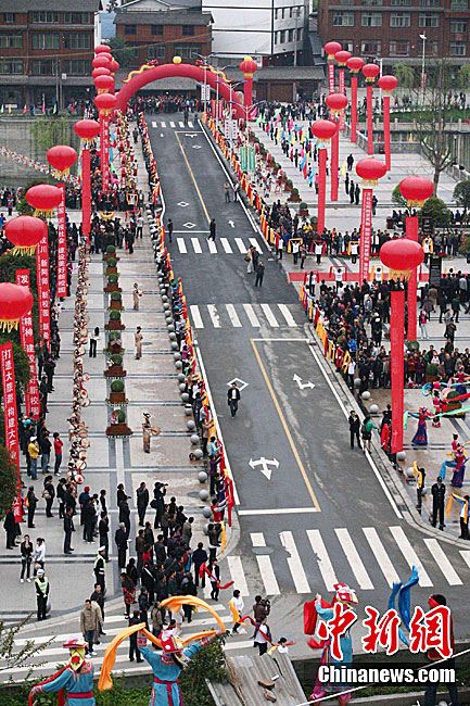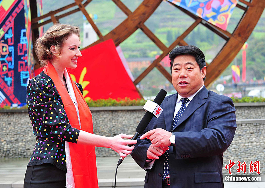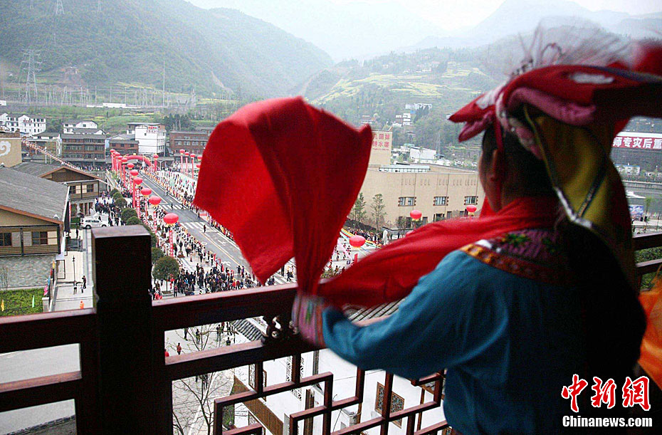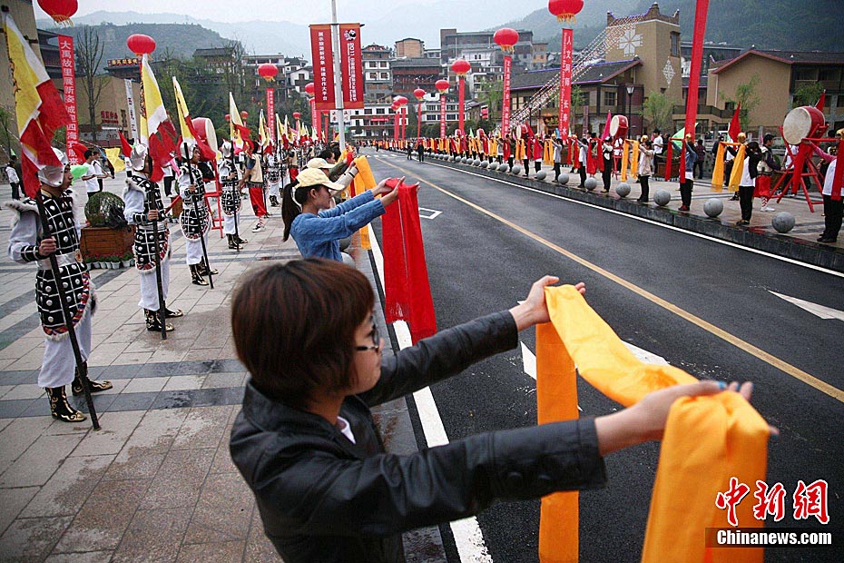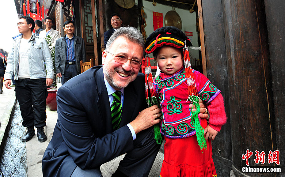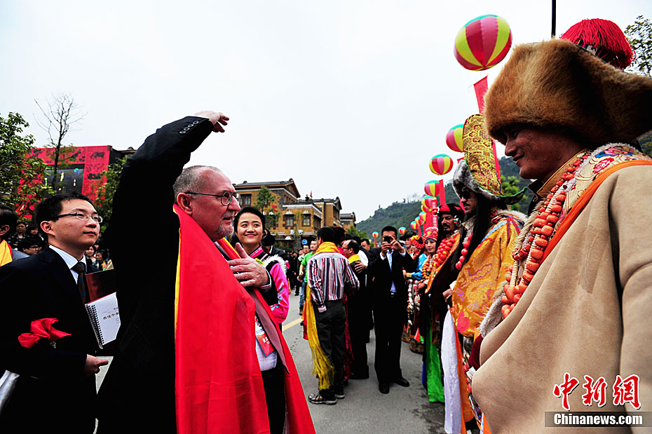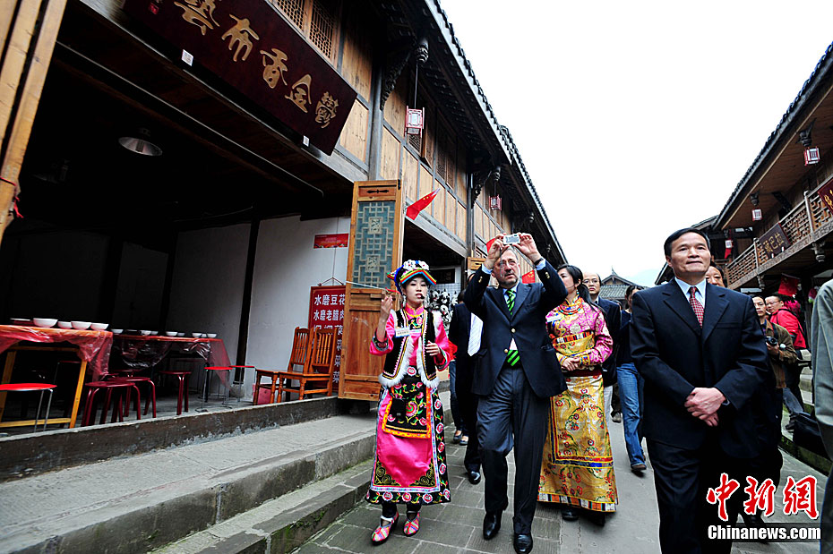 4月19日上午,2011中国四川国际文化旅游节在汶川县水磨镇开幕。开幕式后,与会嘉宾参观了水磨羌城。图为世界旅游组织执行主任索丹·索莫基等海外人士在禅寿老街参观。中新社发 安源 摄