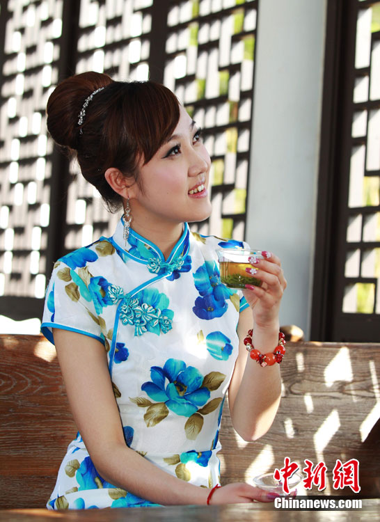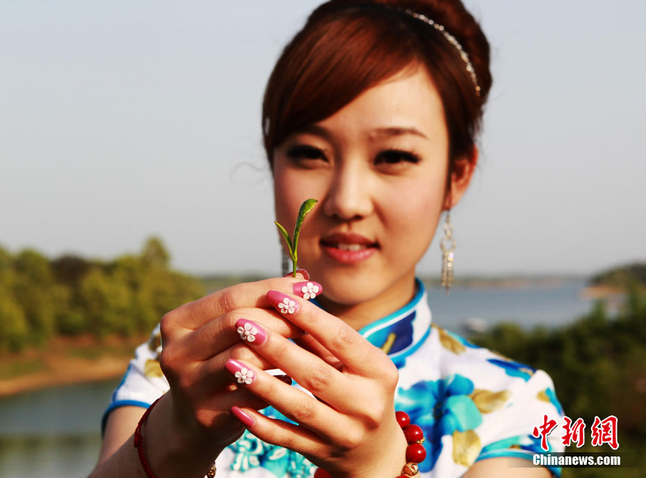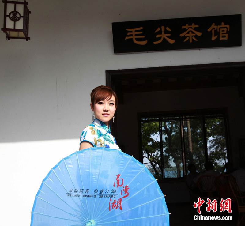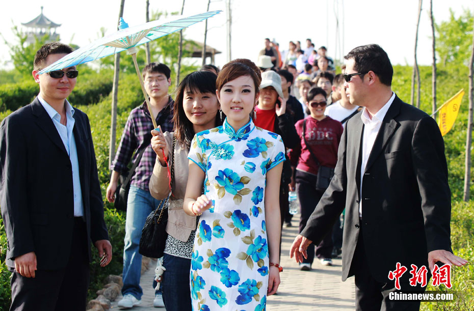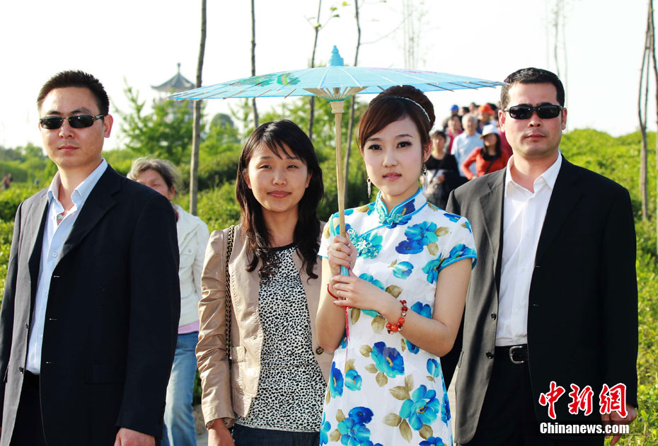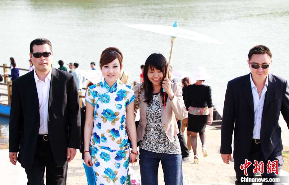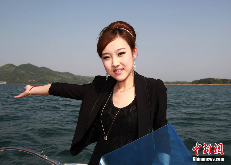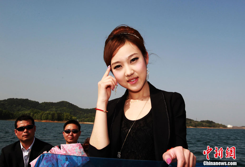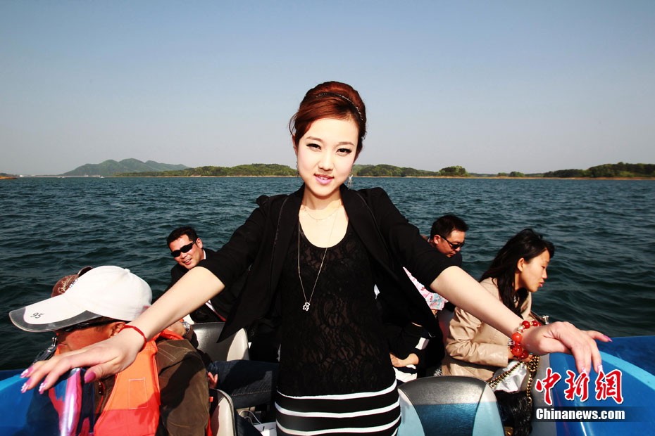 4月23日,河南信阳南湾湖,年薪30万的61岛“美女岛主”黄培陪率众乘坐摩托艇巡岛,两名贴身保镖西服墨镜护身,当日恰逢周末前来南湾湖游玩的民众人山人海,大家岛主来巡,争相上前合影留念,保镖更是尽职尽责为岛主杀开“血路”保驾护航,黄岛主身着中国式旗袍穿行于茶山小道之间,一时间山美水美人更美,南湾湖水映佳人,所到之处立即迎来游客惊羡的目光和欢呼声。中新社记者 王中举 摄