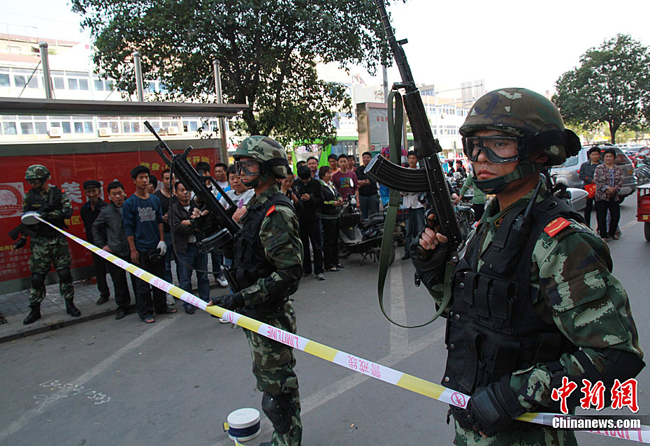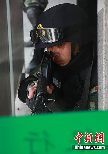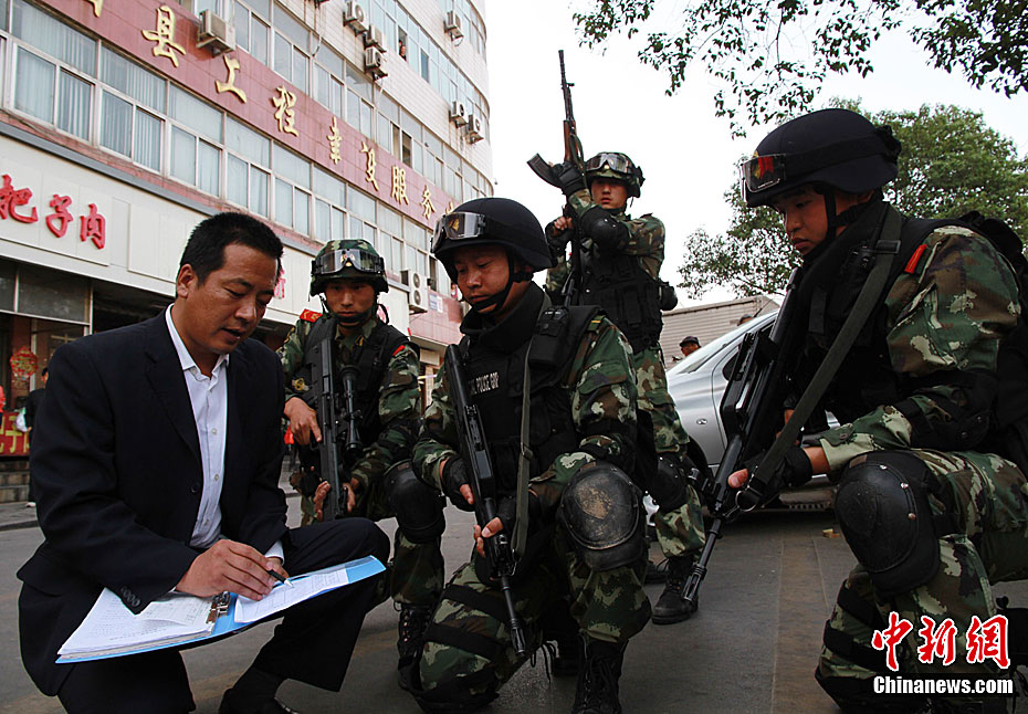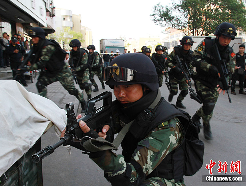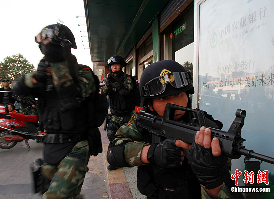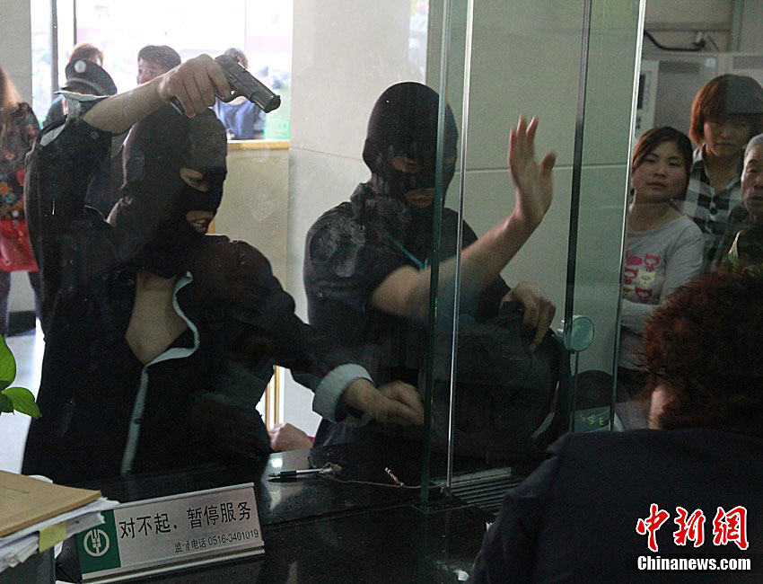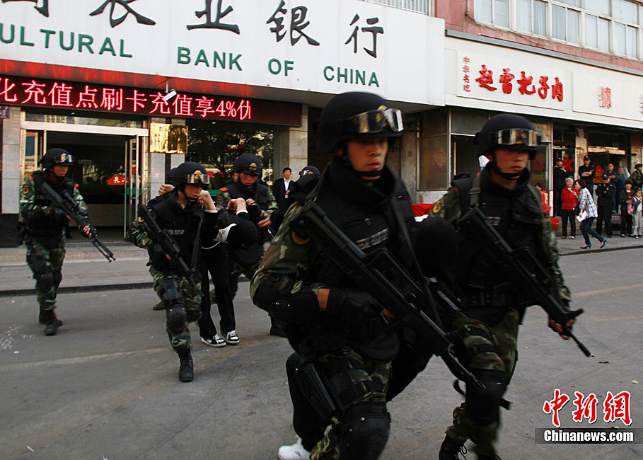 4月26日下午,武警徐州市支队特勤中队与中国农业银行江苏省徐州市翟山支行联合演练银行反抢劫的一个精彩瞬间。为了确保五一小长假徐州市社会稳定,“五一”前夕,武警徐州市支队与银行、学校等几家单位联合举行了几场联合演练。蔡广银 摄 图片来源:CNSPHOTO