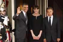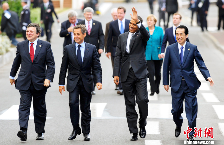 2011年5月26日,参加G8峰会的各国领导人到达位于法国多维尔的会议现场。图为(左起)美国总统奥巴马、法国总统萨科奇、加拿大总理史蒂芬•哈珀、日本首相菅直人、德国总理默克尔、英国首相卡梅伦。