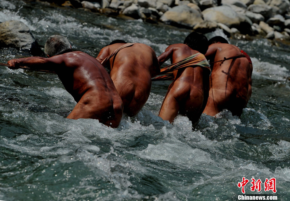 湖北省巴东长江三峡支流神农溪深谷里,至今为旅游保留着人文活化石的纤夫,他们在五月底为参加荆楚文化行的海峡两岸摄影家再现雄姿。川鄂长江激流险滩上的纤夫,历来豪放朴实、果敢尚义、爱喝烈酒。其缆绳取最好竹子划出的竹青编成,靠上好的“白官布”制作而成的搭肩。逆水而上时,纤夫腰成满弓,纤缆如弦,在陡峭山岸上手抠岩缝,赤脚草鞋寻找水石里的抗争支点,汗珠摔成八瓣,胸腔挤压出“嘿佐”的号子,一步步艰难前行。好在如今公路比行船便利,身为山寨移民的纤夫主要为旅游服务。中新社发 贾国荣 摄