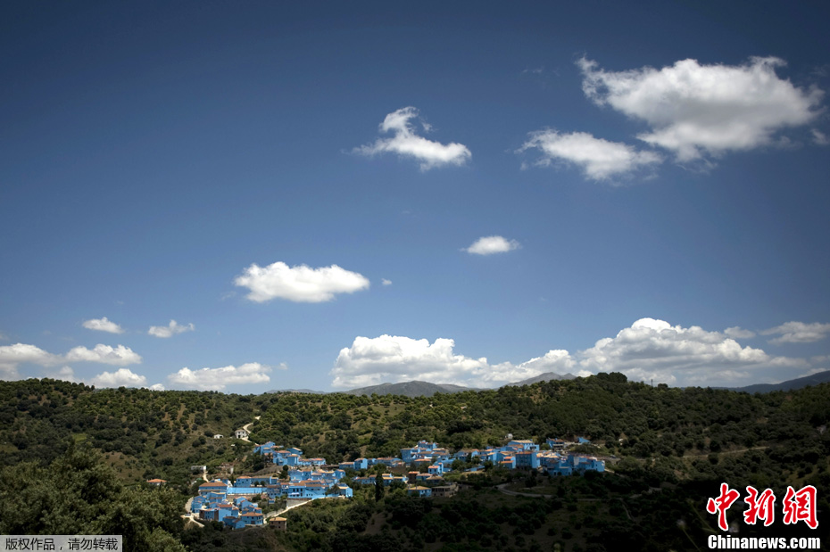 6月10日,西班牙马拉加市附近一个村庄,房屋全被涂成梦幻蓝色后的美丽景象。此举是《蓝精灵》电影全球宣传活动的一部分,由美国哥伦比亚影片公司和索尼动画影视公司制作的电影版《蓝精灵》将于6月下旬上映。