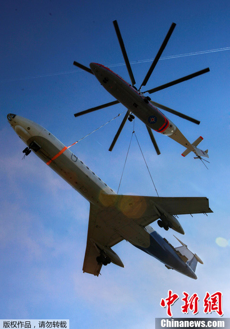 资料图为2009年4月16日,在俄罗斯圣彼得堡附近的一处紧急情况训练中心,一架图-134飞机被Mi-26直升机吊起。