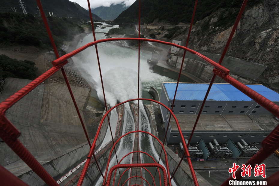 6月25日,武警水电三总队今年6月新建成的西藏林芝老虎嘴水电站,开始丰水季节泄洪发电。这里也成为西藏目前水电第一高坝,电力将于今年并入国家电网。中新社发 贾国荣 摄