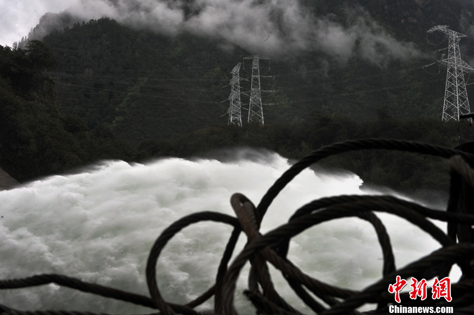 6月25日,武警水电三总队今年6月新建成的西藏林芝老虎嘴水电站,开始丰水季节泄洪发电。这里也成为西藏目前水电第一高坝,电力将于今年并入国家电网。中新社发 贾国荣 摄