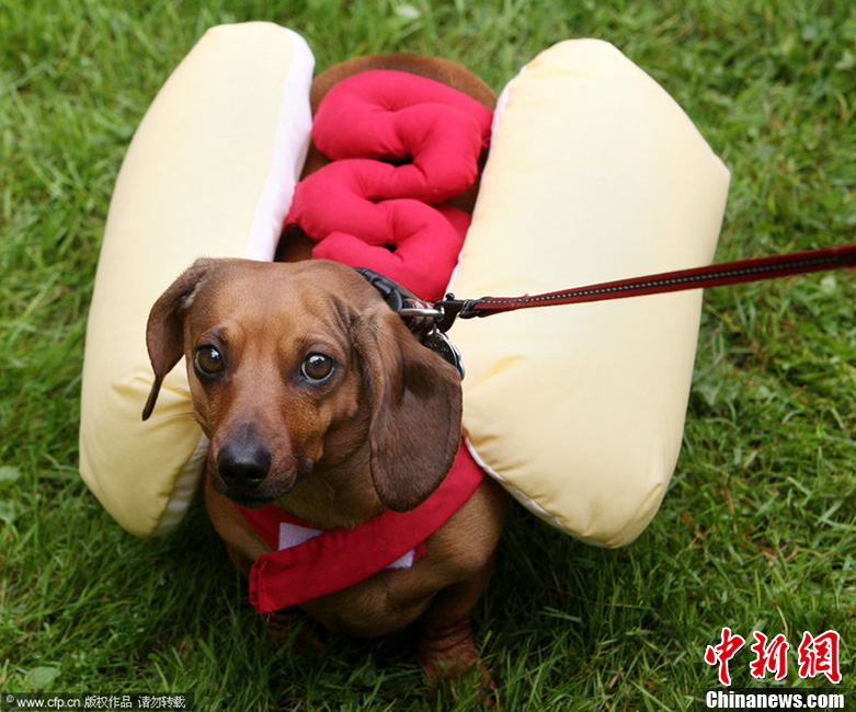加拿大举办腊肠狗展 小狗穿“热狗”外衣