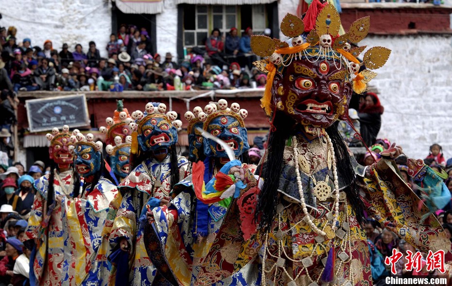 今年6月26日至6月30日即藏历4月25日至藏历4月29日,西藏直贡梯寺迎来了一年一度的夏季大法会。已有830多年历史的直贡梯寺是藏传佛教直贡噶举派的祖庭。直贡梯寺于每年藏历4月25日举行法会,为期5天。藏历4月25日为直贡梯寺创始人觉巴·记登工布圆寂之日,为纪念他,每年此日,直贡梯寺都会举办法会。金刚神舞,藏语叫“羌姆”,通俗的说法是“跳神”,这是藏传佛教僧侣表演的一种宗教仪式舞蹈。这种舞有单人舞、双人舞和集体舞三种形式。跳舞时戴面具,穿长袍,佩彩带和刀盾。伴奏的乐器有舞钹、牛角号、唢呐等。图为法会现场。中新社发 李林 摄