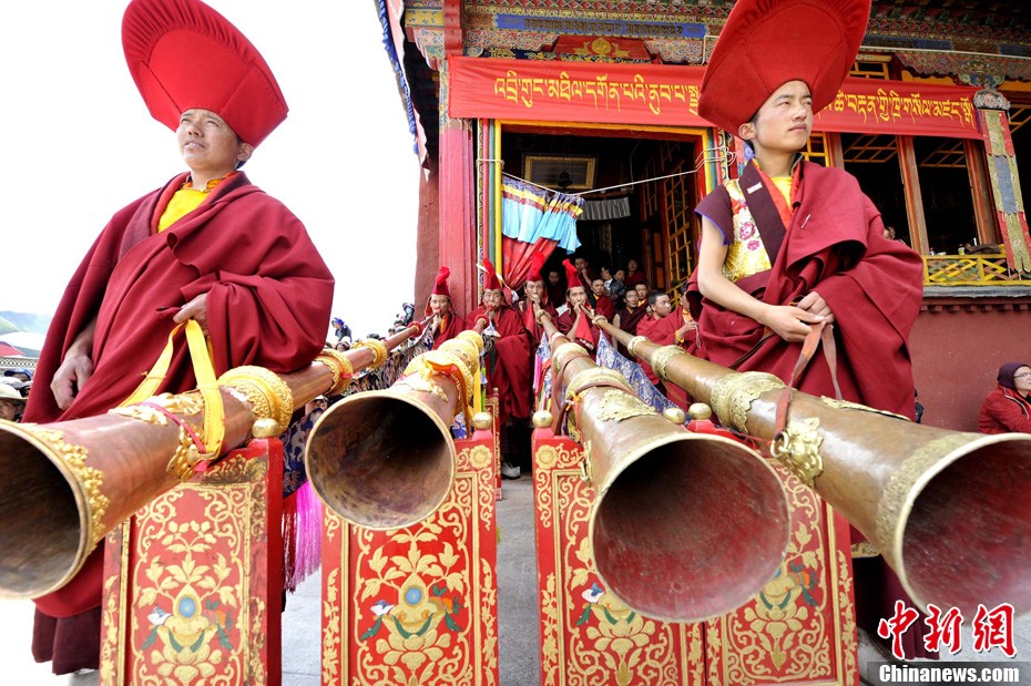 今年6月26日至6月30日即藏历4月25日至藏历4月29日,西藏直贡梯寺迎来了一年一度的夏季大法会。已有830多年历史的直贡梯寺是藏传佛教直贡噶举派的祖庭。直贡梯寺于每年藏历4月25日举行法会,为期5天。藏历4月25日为直贡梯寺创始人觉巴·记登工布圆寂之日,为纪念他,每年此日,直贡梯寺都会举办法会。金刚神舞,藏语叫“羌姆”,通俗的说法是“跳神”,这是藏传佛教僧侣表演的一种宗教仪式舞蹈。这种舞有单人舞、双人舞和集体舞三种形式。跳舞时戴面具,穿长袍,佩彩带和刀盾。伴奏的乐器有舞钹、牛角号、唢呐等。图为法会现场。中新社发 李林 摄