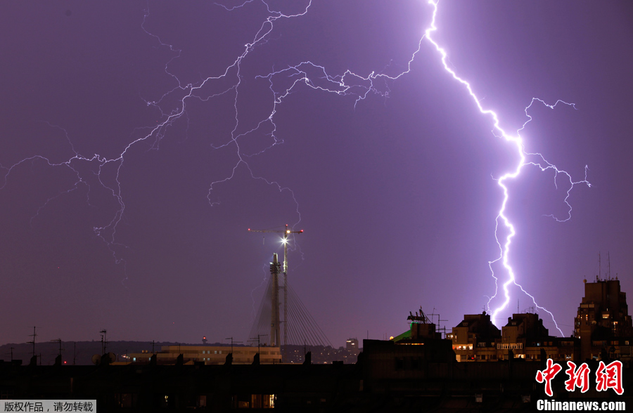 7月11日,塞尔维亚首都贝尔格莱德在一场雷雨中再遭闪电袭击。在此前的6月8日夜间,贝尔格莱德也上演过一幕壮观的“闪电袭城”画面。据悉,今夏的塞尔维亚雷雨天气很常见。