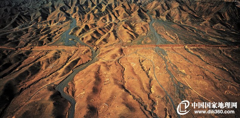 在宁夏平原西北部,三关口明长城静卧在从贺兰山东麓喷涌而成的冲积扇的扇中部位。这是因为扇体中部的土壤较为干燥,长城的地基不会被潮湿的土壤腐蚀。尽管扇中部位比更低处的扇缘更易遭到山洪的侵袭,但城墙依然屹立,数百年不倒。王琛 摄 图片来源:中国国家地理网