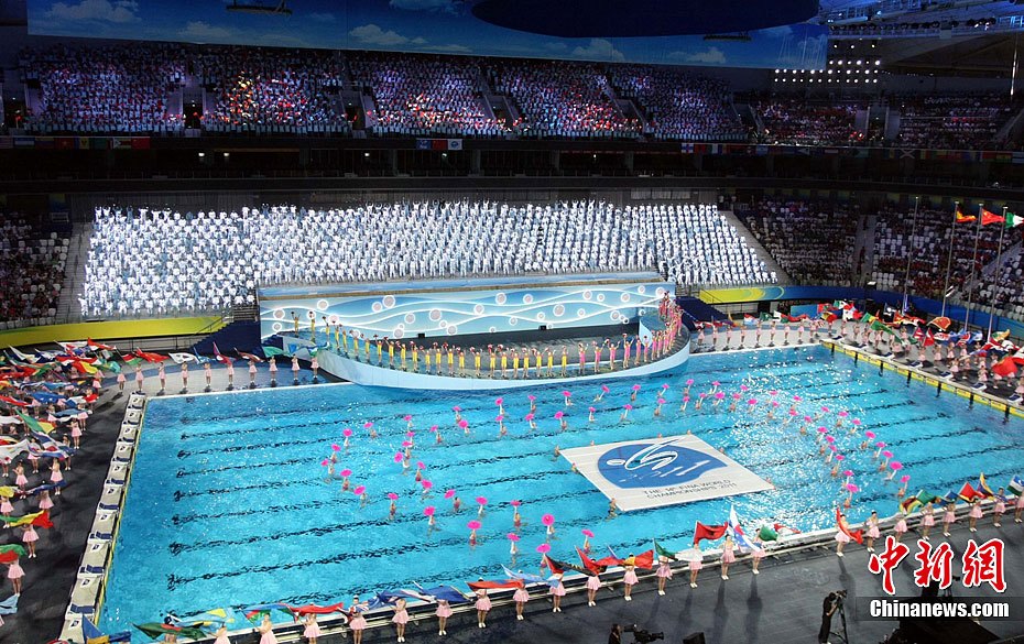 7月16日晚,第14届国际泳联世界游泳锦标赛在上海东方体育中心举行开幕式。在为期16天的比赛时间里,全球181个国家和地区的2000多名泳坛健将们将在跳水、水球、花样游泳、游泳(包括公开水域)四个大项、66个小项中展开激烈竞争。中新社发 汤彦俊 摄