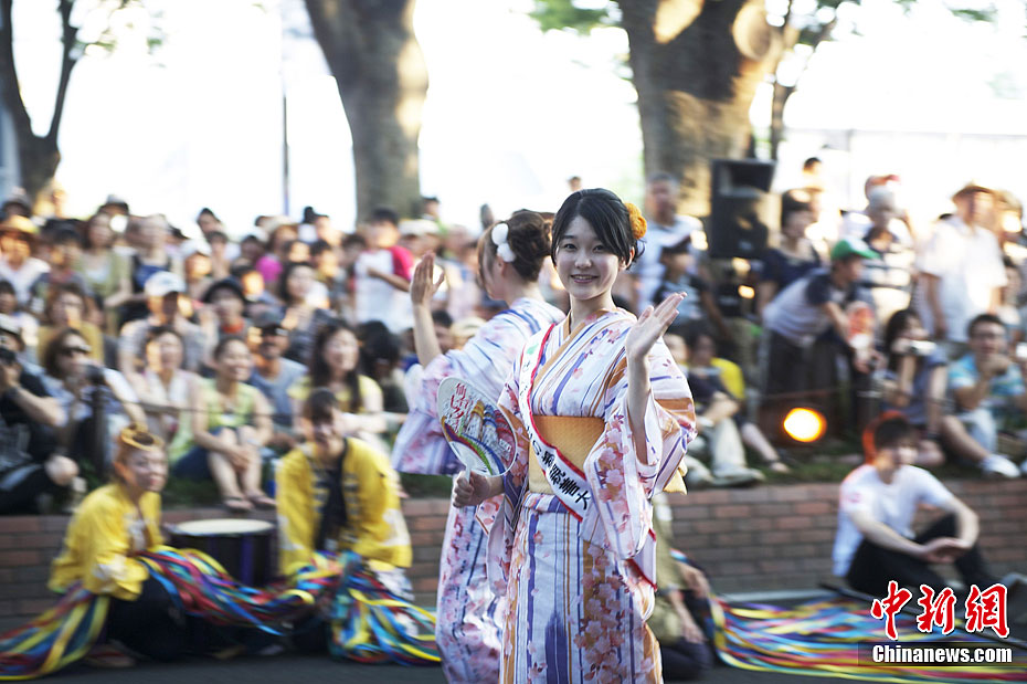 7月16日到17日,日本地震灾区宫城县仙台市举行六魂祭大型活动。本次活动首次把日本东北六县的各自的传统夏日庆典活动汇聚一堂,包括青森灯笼祭,秋田竿灯祭,岩手县盛冈SANSA舞祭,山形花笠祭,仙台七夕祭,福岛草鞋祭。主办方预计两天将有10万人前来观礼,但16日首日人数已经超过10万人。同时高温天气导致25人因中暑而晕倒。主办方不得不提前中断本次活动。中新社发 孙冉 摄
