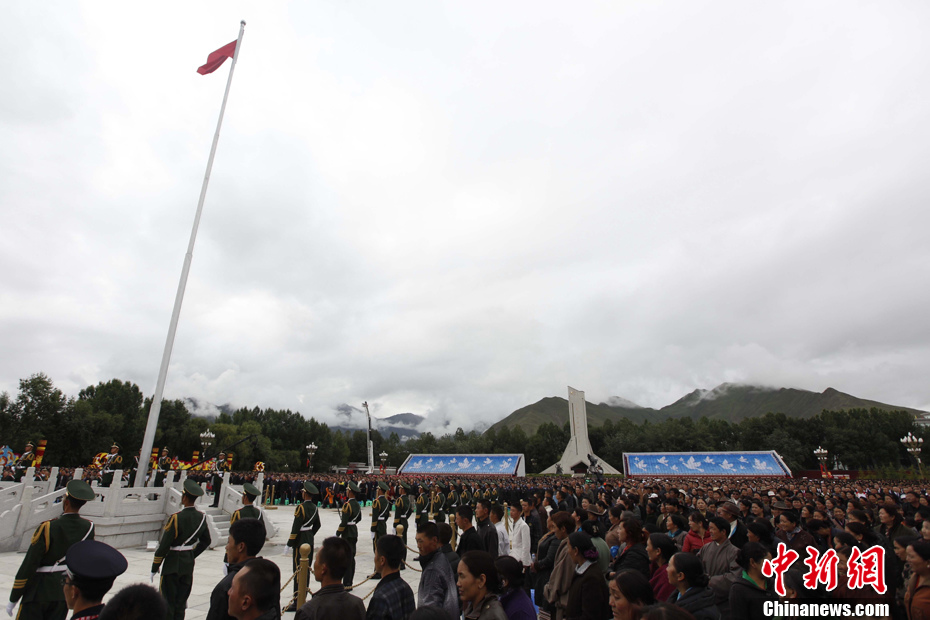 7月19日,西藏和平解放60周年庆祝大会在拉萨举行。图为举行升旗仪式。中新社发 盛佳鹏 摄