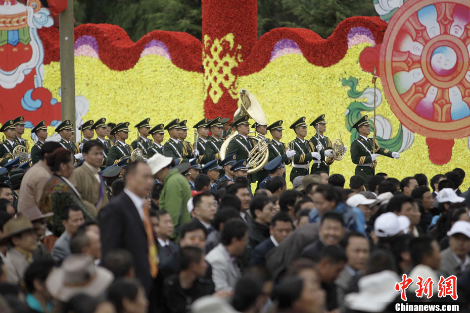 7月19日,西藏和平解放60周年庆祝大会在拉萨举行。图为军乐队入场。中新社发 盛佳鹏 摄