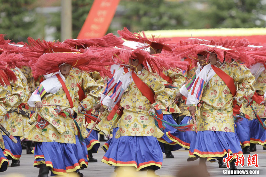 7月19日,西藏和平解放60周年庆祝大会在拉萨举行。图为参加群众游行活动的表演方阵进行精彩的演出。中新社发 盛佳鹏 摄