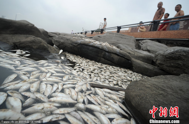 2011年07月21日,天津,海河现大面积死鱼群。这种鱼俗称“小刺鱼”,又称“青线鱼”,大多是从海水中倒灌回游到海河中的。由于这些鱼不是典型的淡水鱼,因此其抗压能力比淡水鱼要小很多。塘沽环保监察支队的工作人员表示,除天气原因之外,连日来的降水,大量地表污染物跟随雨水注入海河,水体受到影响,也影响了“小刺鱼”的生活环境,造成鱼群闷呛而死。图片来源:CFP视觉中国