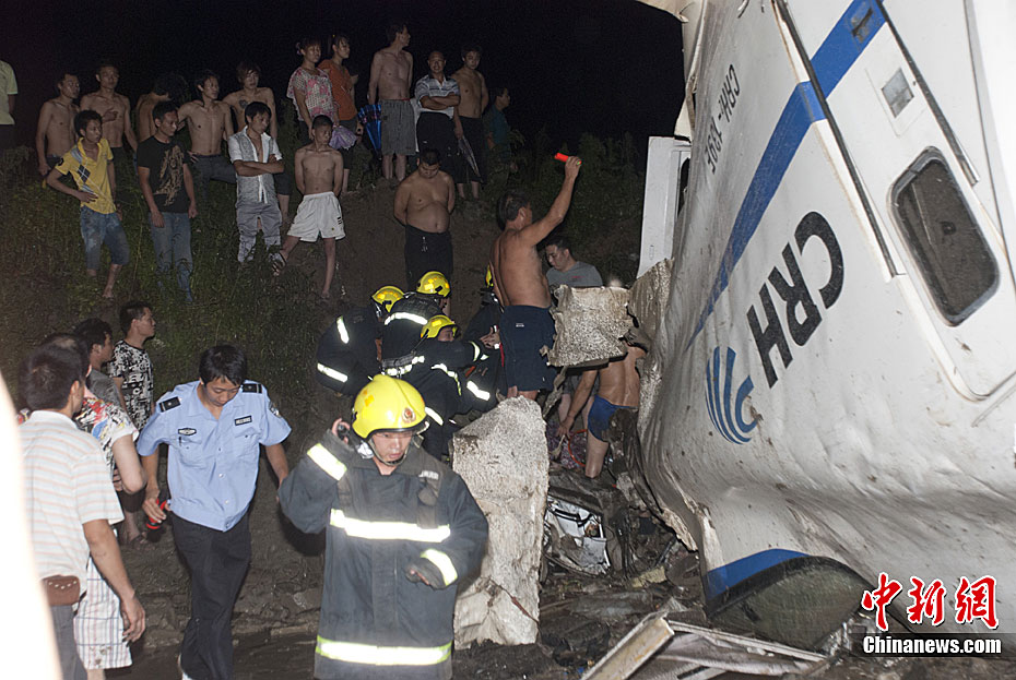 7月23日,从铁道部获悉,23日20时50分,杭深线永嘉至温州南间,北京南至福州D301次列车与杭州至福州南D3115次列车发生追尾事故。D301次列车第1至4位脱线,D3115次列车第15、16位脱线。记者从事故现场方面获悉,目前事故已造成11人死亡,89人被送往医院。中新社发 小刀 摄 图片来源:CNSPHOTO