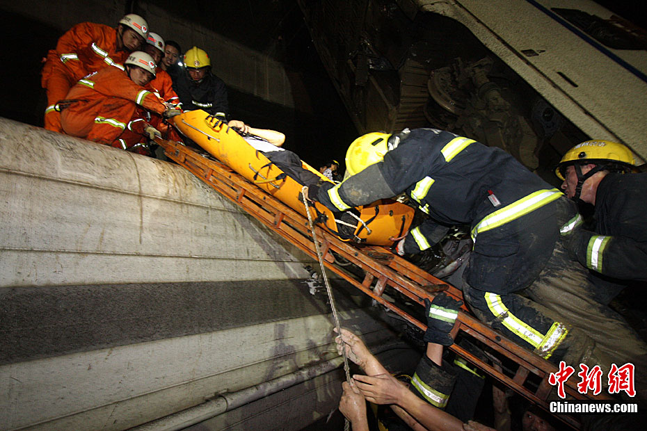 7月23日,从铁道部获悉,23日20时50分,杭深线永嘉至温州南间,北京南至福州D301次列车与杭州至福州南D3115次列车发生追尾事故。D301次列车第1至4位脱线,D3115次列车第15、16位脱线。记者从事故现场方面获悉,目前事故已造成11人死亡,89人被送往医院。中新社发 长空 摄 图片来源:CNSPHOTO