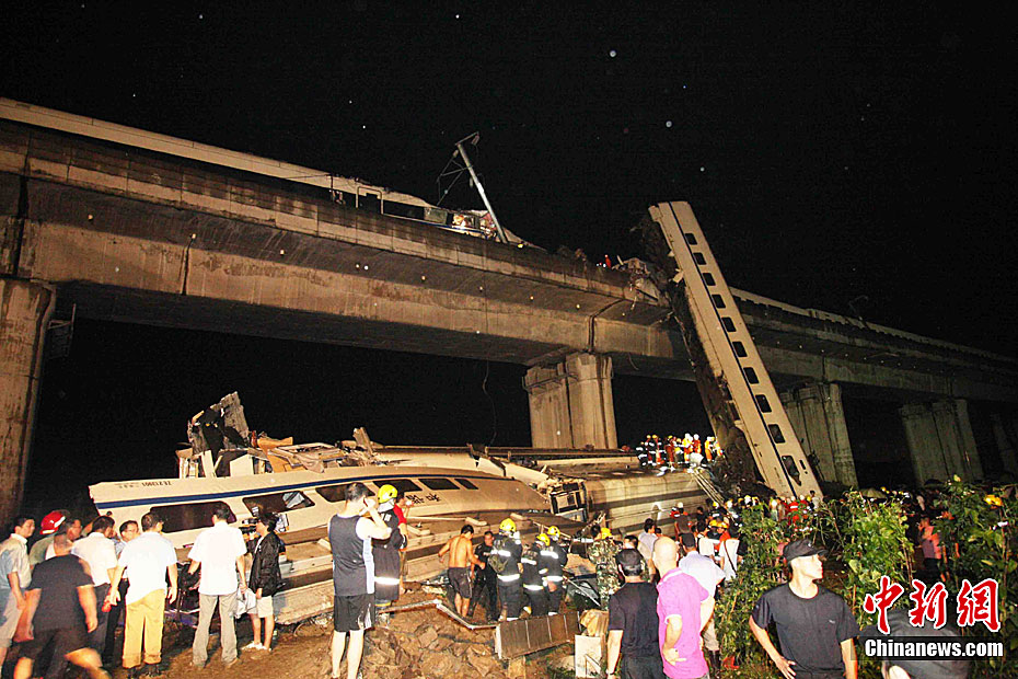 7月23日,从铁道部获悉,23日20时50分,杭深线永嘉至温州南间,北京南至福州D301次列车与杭州至福州南D3115次列车发生追尾事故。D301次列车第1至4位脱线,D3115次列车第15、16位脱线。记者从事故现场方面获悉,目前事故已造成11人死亡,89人被送往医院。中新社发 长空 摄 图片来源:CNSPHOTO