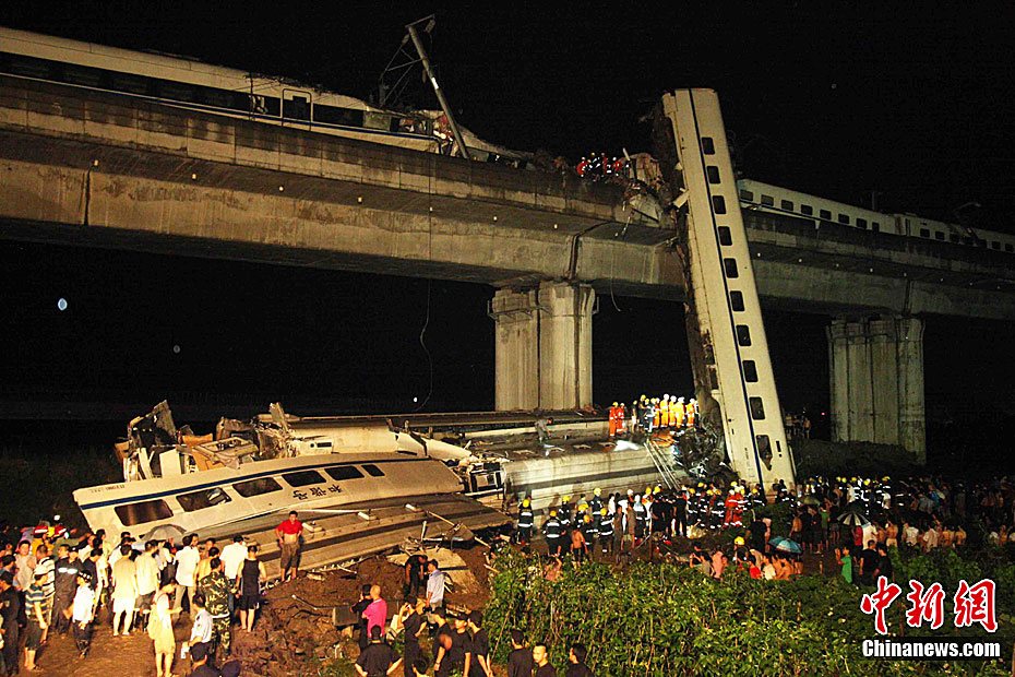 7月23日,从铁道部获悉,23日20时50分,杭深线永嘉至温州南间,北京南至福州D301次列车与杭州至福州南D3115次列车发生追尾事故。D301次列车第1至4位脱线,D3115次列车第15、16位脱线。记者从事故现场方面获悉,目前事故已造成11人死亡,89人被送往医院。中新社发 长空 摄 图片来源:CNSPHOTO