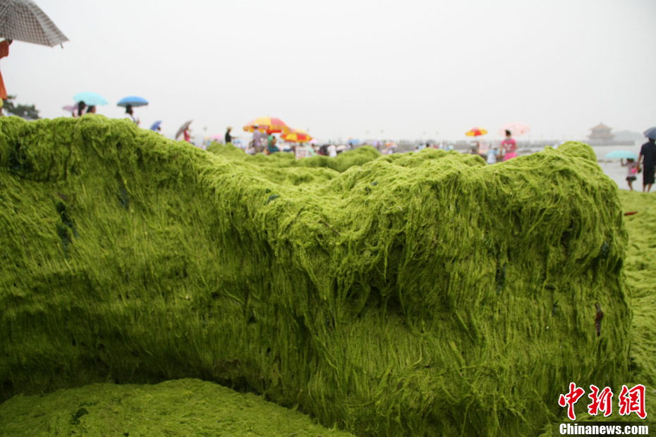 7月27日,青岛栈桥海域浒苔肆虐。连日来,山东省青岛市各相关部门按照“Ⅳ级绿潮灾害应急响应”要求,不间断地组织人员、机械清理浒苔,共同抵御大面积绿潮灾害对岛城的影响。根据国家海洋局北海分局的监测报告,截至7月26日,黄海海域浒苔绿潮总覆盖面积达到629平方公里,总分布面积约22600平方公里。未来几天浒苔或将继续向偏北方向漂移。中新社发 黄杰显 摄 图片来源:CNSPHOTO