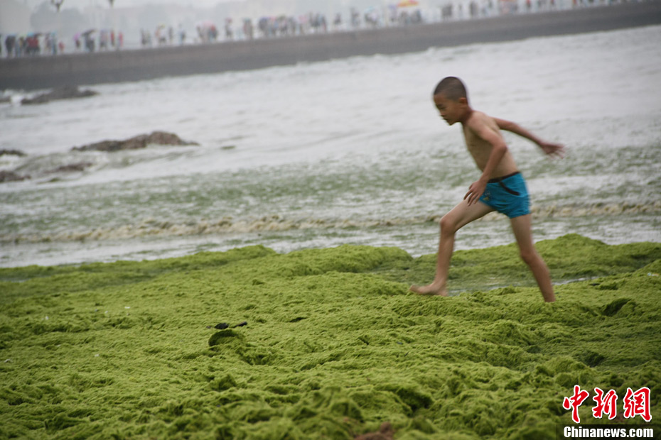 7月27日,青岛栈桥海域浒苔肆虐。连日来,山东省青岛市各相关部门按照“Ⅳ级绿潮灾害应急响应”要求,不间断地组织人员、机械清理浒苔,共同抵御大面积绿潮灾害对岛城的影响。根据国家海洋局北海分局的监测报告,截至7月26日,黄海海域浒苔绿潮总覆盖面积达到629平方公里,总分布面积约22600平方公里。未来几天浒苔或将继续向偏北方向漂移。中新社发 黄杰显 摄 图片来源:CNSPHOTO