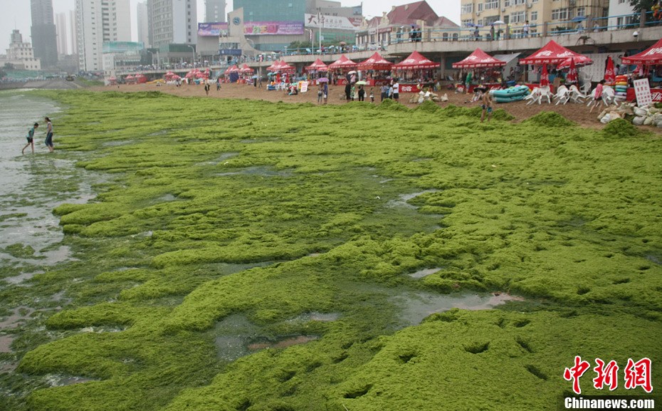 7月27日,青岛栈桥海域浒苔肆虐。连日来,山东省青岛市各相关部门按照“Ⅳ级绿潮灾害应急响应”要求,不间断地组织人员、机械清理浒苔,共同抵御大面积绿潮灾害对岛城的影响。根据国家海洋局北海分局的监测报告,截至7月26日,黄海海域浒苔绿潮总覆盖面积达到629平方公里,总分布面积约22600平方公里。未来几天浒苔或将继续向偏北方向漂移。中新社发 黄杰显 摄 图片来源:CNSPHOTO