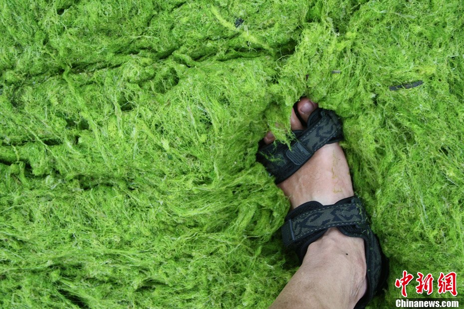 7月27日,青岛栈桥海域浒苔肆虐。连日来,山东省青岛市各相关部门按照“Ⅳ级绿潮灾害应急响应”要求,不间断地组织人员、机械清理浒苔,共同抵御大面积绿潮灾害对岛城的影响。根据国家海洋局北海分局的监测报告,截至7月26日,黄海海域浒苔绿潮总覆盖面积达到629平方公里,总分布面积约22600平方公里。未来几天浒苔或将继续向偏北方向漂移。中新社发 黄杰显 摄 图片来源:CNSPHOTO