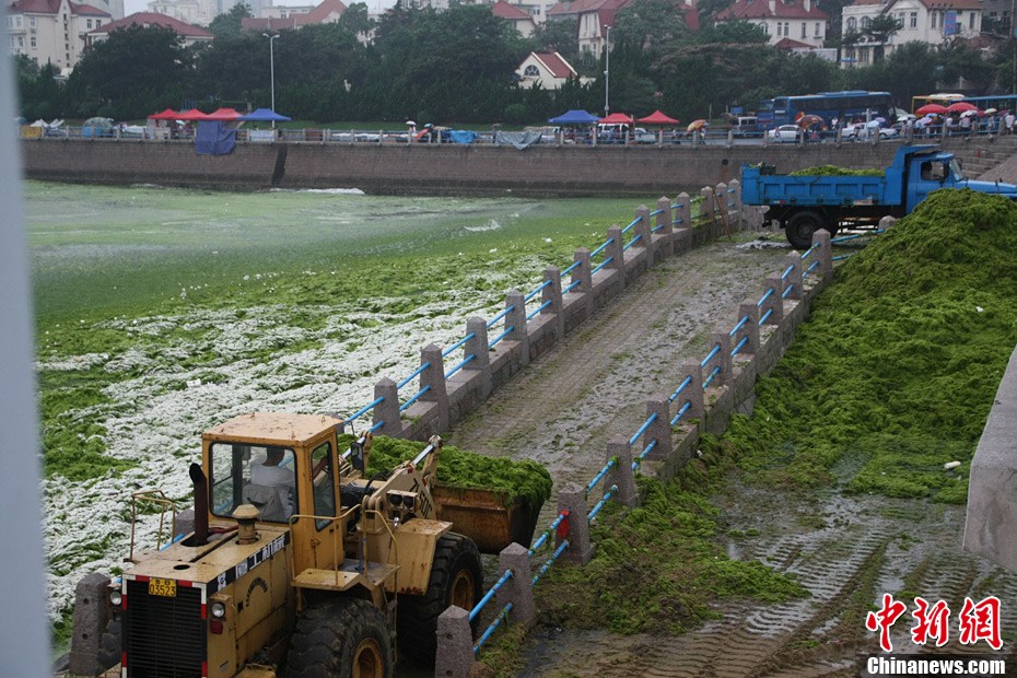 7月27日,青岛栈桥海域浒苔肆虐。连日来,山东省青岛市各相关部门按照“Ⅳ级绿潮灾害应急响应”要求,不间断地组织人员、机械清理浒苔,共同抵御大面积绿潮灾害对岛城的影响。根据国家海洋局北海分局的监测报告,截至7月26日,黄海海域浒苔绿潮总覆盖面积达到629平方公里,总分布面积约22600平方公里。未来几天浒苔或将继续向偏北方向漂移。中新社发 黄杰显 摄 图片来源:CNSPHOTO