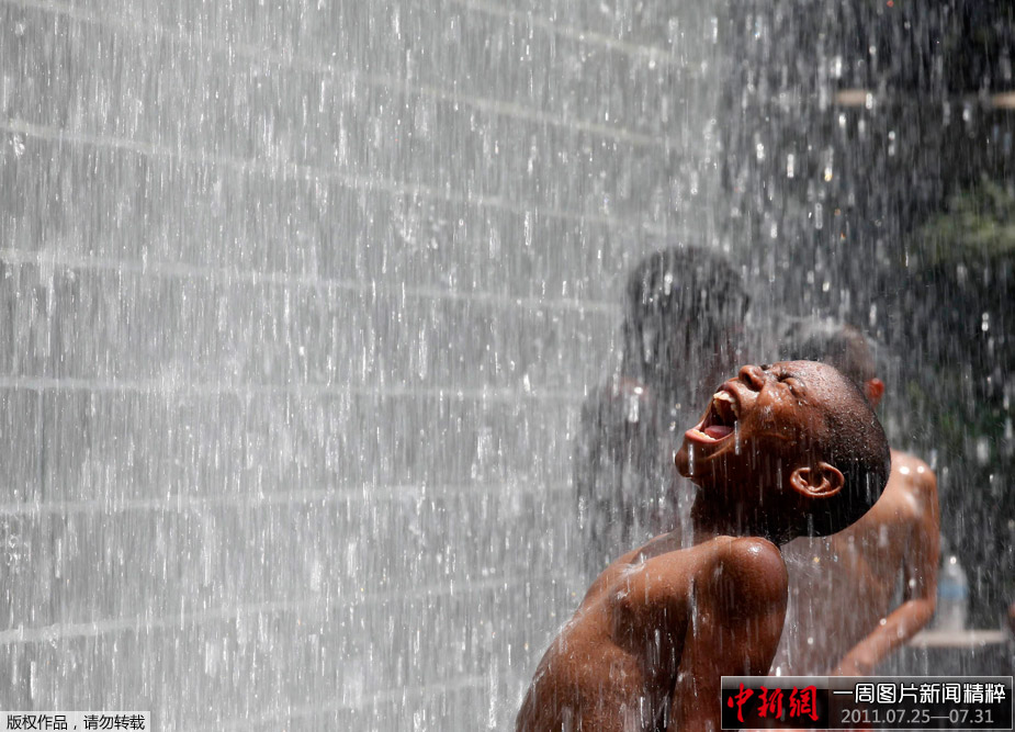 25日,芝加哥,一个男孩在喷泉前玩耍。上一周,热浪肆虐美国东海岸,使东岸多个城市高温创纪录。首都华盛顿地区创下高温逾摄氏49度的纪录,纽约市中央公园测得40度高温,打破1957年创下的38.3度纪录;邻近的新泽西州纽瓦克市,气温达到了破当地纪录的42度。