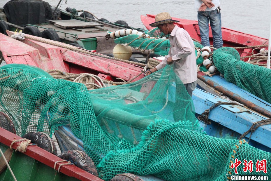 被戏谑为“梅超风”的第9号强台风“梅花”逐渐向浙江逼近。目前,浙江海事部门已启动二级防台警报。截至8月5日14时,浙南辖区已有20余条客运航线停航,目前在浙江辖区内避风的商船达到4000余艘,仅舟山海域就有近万艘商渔船归港避风。图为渔民收拾渔网。中新社发 江耘 摄