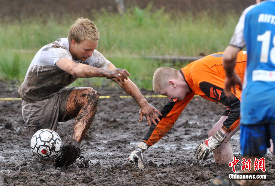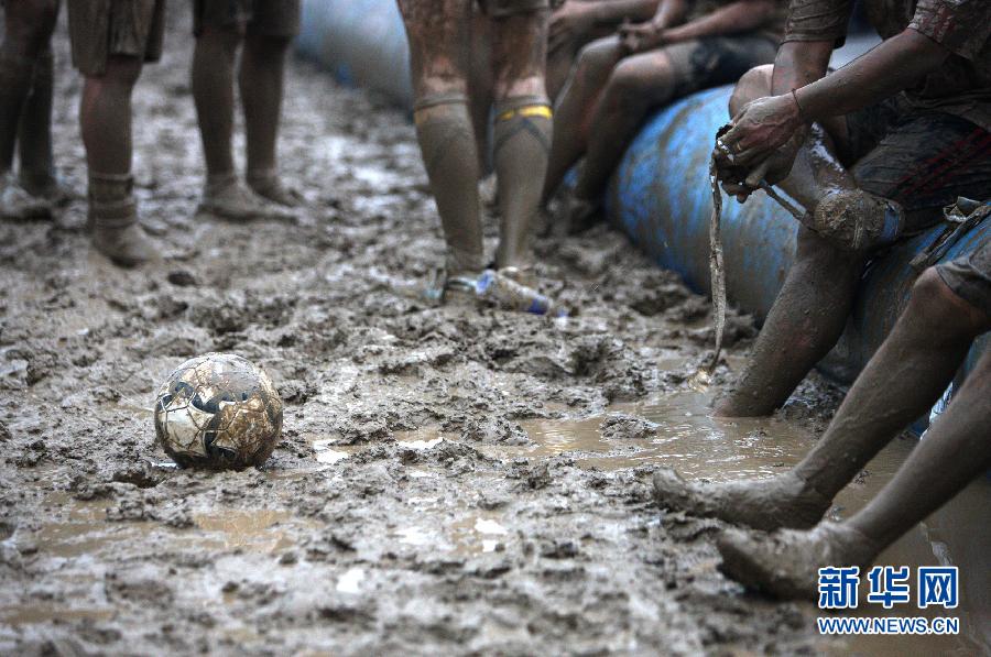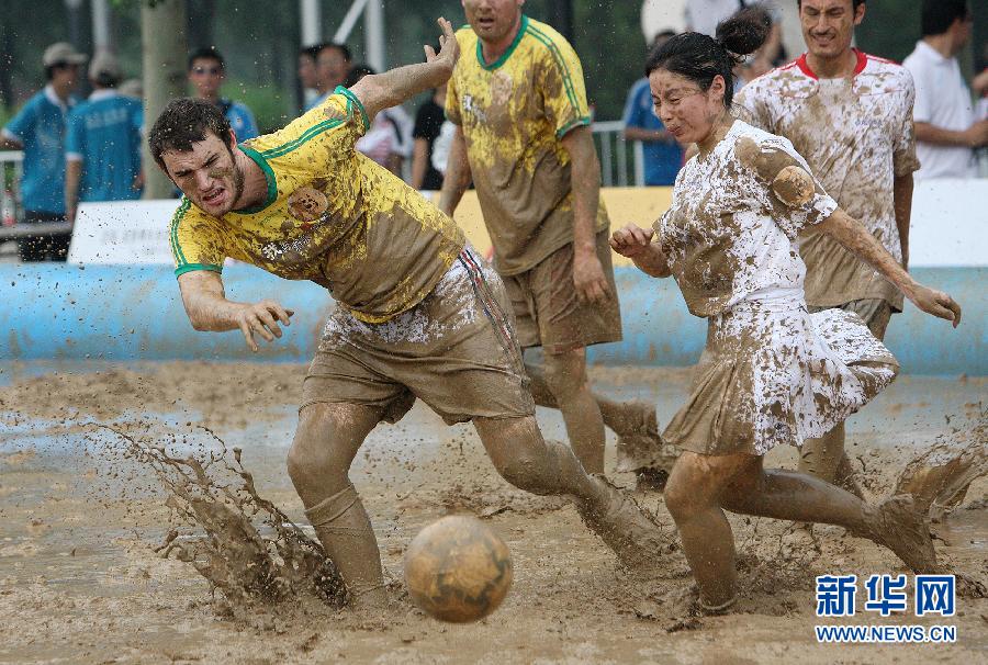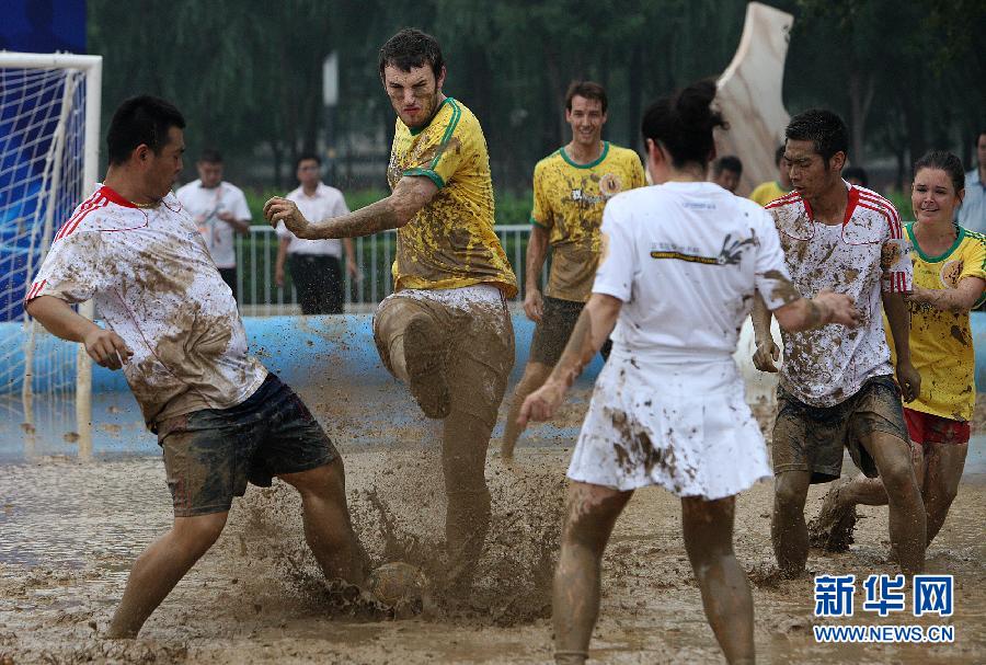8月9日,中国安洁队门将在防守点球。当日,2011泥浆足球世界杯中国赛在北京奥林匹克公园正式开赛。这是泥浆足球赛首次在中国举行。新华社发(万象摄)图片来源:新华网