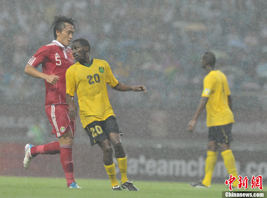 8月10日晚,中国男足在安徽合肥奥体中心迎战牙买加队,这是中国男足征战世预赛20强赛前的最后一场热身。上半场,中国队4号赵鹏在第九分半时,利用角球,前点头球抢点,敲开了牙买加的大门,最终以1:0战胜牙买加队。图为整场比赛在暴雨中进行。中新社发 张娅子 摄