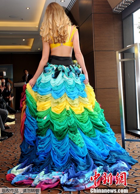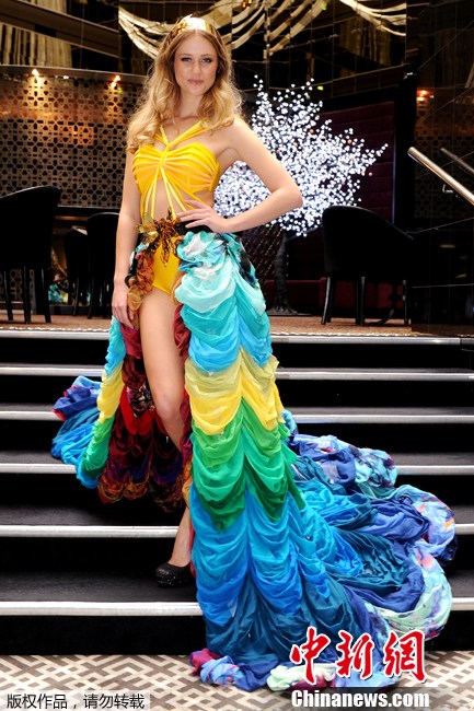2011年8月10日,澳大利亚墨尔本,澳大利亚环球小姐冠军Scherri-Lee Biggs身着盛装亮相,她将穿着这套服装代表澳大利亚参加在巴西举办的世界环球小姐总决赛。这套服装的灵感来自于澳大利亚的Kooey泳装,旨在反映国家的文化美和精神。