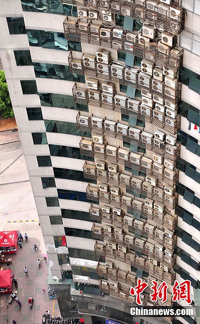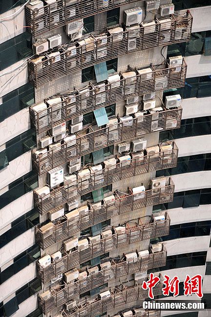 8月11日,在福州大利嘉城大厦外墙上,密密麻麻都是空调外机,整面大厦外墙共挂着500多台空调室外机且还在不断增加,被市民称为福州史上最牛“空调墙”。据了解,该楼高25层,没有统一配备中央空调,平日里租借给企业、商户作办公经营之用。图为:2011年8月11日,拍摄的福州大利嘉城大厦外墙上,近20米的外墙挂满了空调压缩机。中新社发 张斌 摄 图片来源:CNSPHOTO