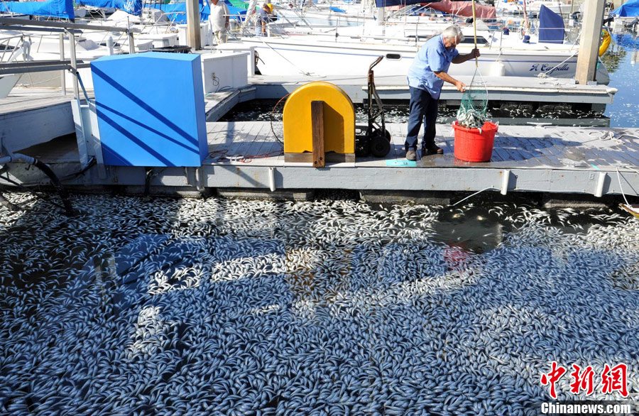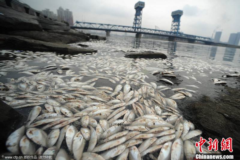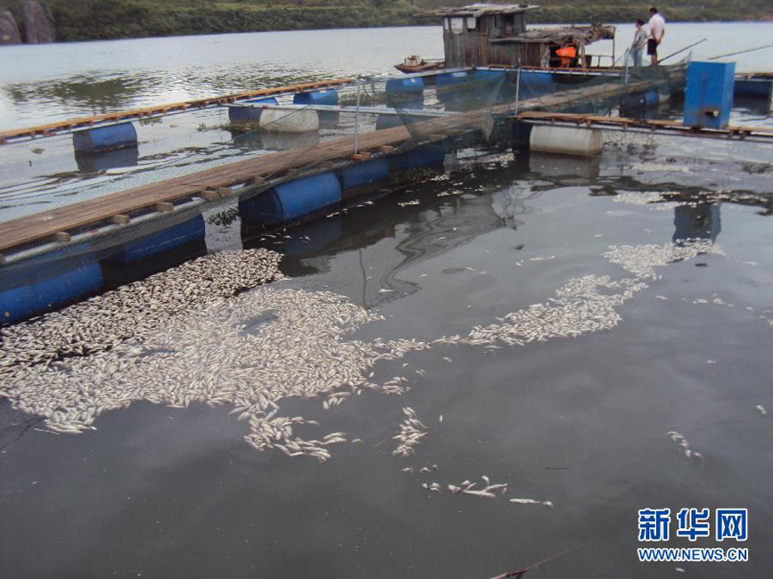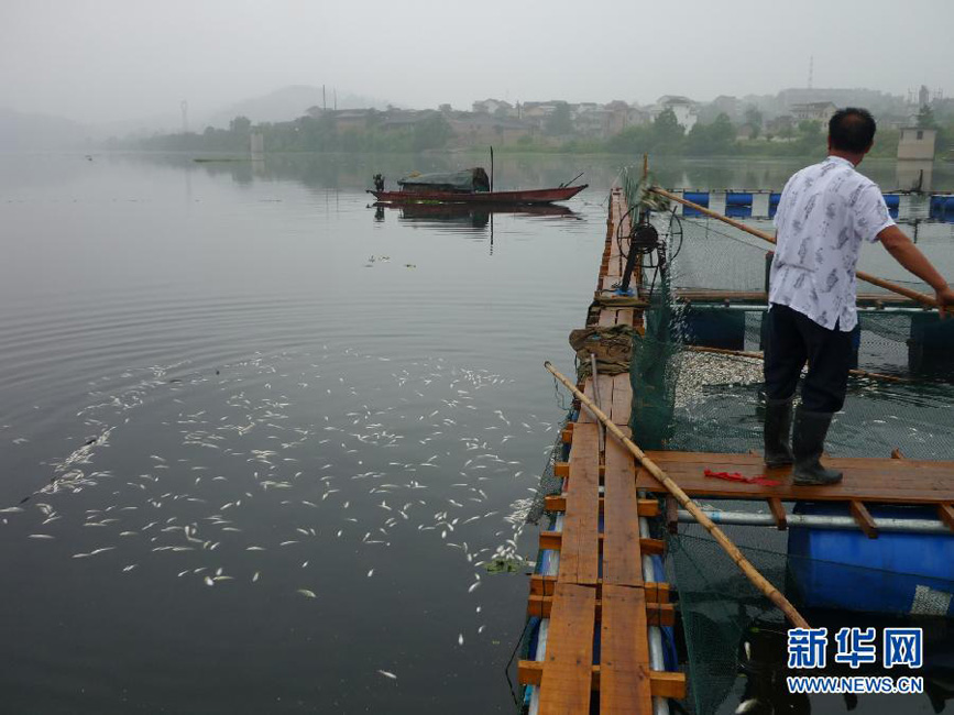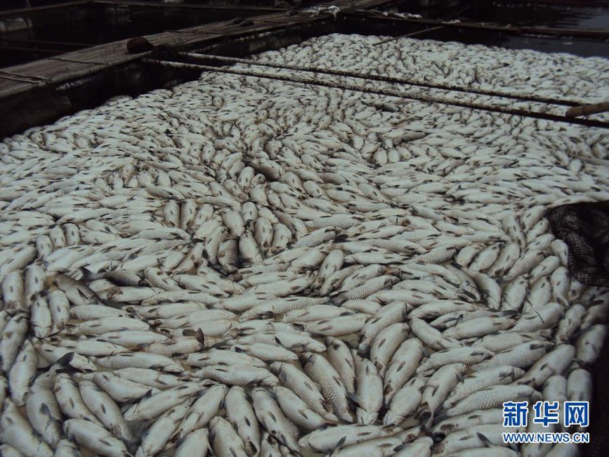 8月10日,湖南新邵,养殖户蹲在网箱上打捞已死亡的鱼苗。连日来,资江湖南新邵段自上游至下游百余里河道相继发生大规模死鱼事件,众多养鱼专业户网箱养殖鱼陆续死亡,资江河内野生鱼类也大面积死亡。据介绍,死鱼河段约55公里,自新邵县与邵阳市区交界的阳溪桥起,延伸到新邵筱溪水电站大坝处。死鱼事件共涉及到新邵县130余户养鱼专业户初步统计损失200多吨鱼(野生鱼无法统计),渔民直接经济损失超过2000万。刘良恒 摄 图片来源:新华网