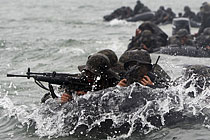 当地时间8月16日,韩美2011年度“乙支自由卫士”联合军演正式开始,将持续至26日。据韩美联合司令部介绍,此次演习是以防御为中心的年度例行军演,由韩美联合司令部主管,为指挥所电脑模拟作战。演习内容包括演练高级军事指挥官的决策能力,训练韩美两国指挥官和参谋的计划、指挥、管制、情报、补给等协同作战能力。图为韩国南扬州市举行的反恐演习。