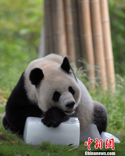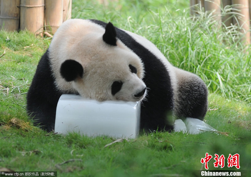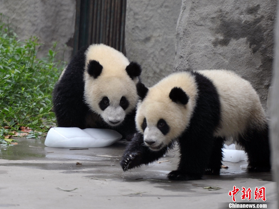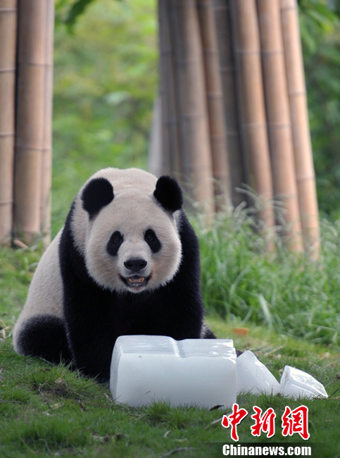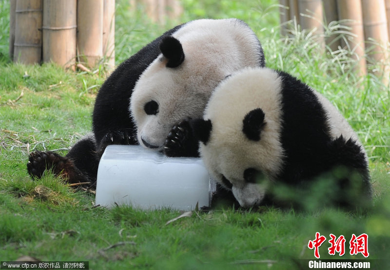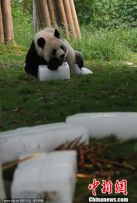 8月17日,成都的高温天气仍在持续,繁育研究基地内的大熊猫与冰为伴。大熊猫除在室内享受空调生活外,工作人员还在室外园区放置了大量的冰块,让大熊猫在玩耍之余也能降温避暑。图为大熊猫与冰共“舞”。中新社发 刘忠俊 摄