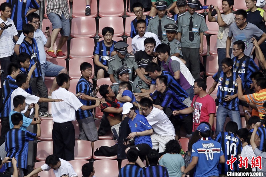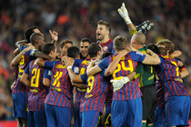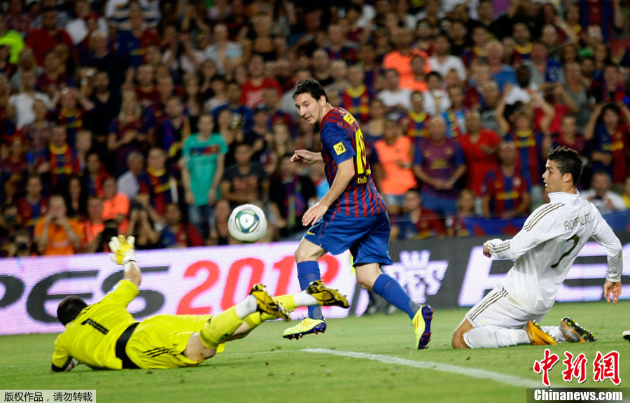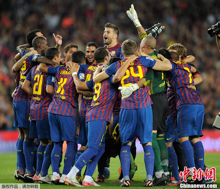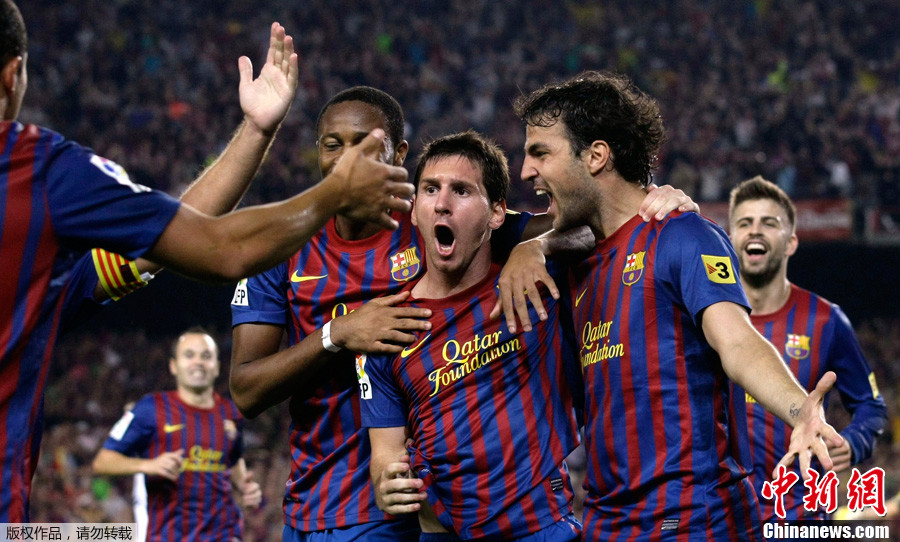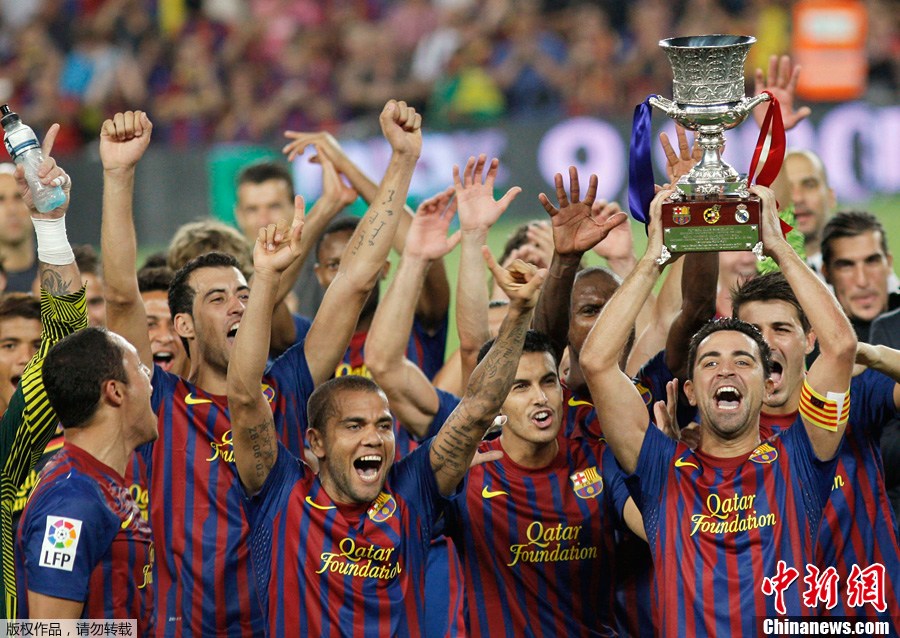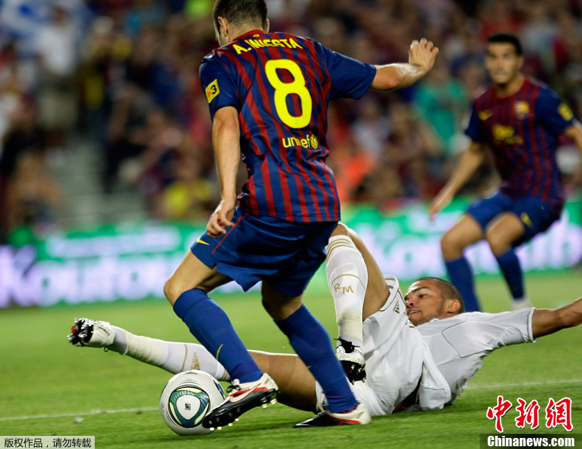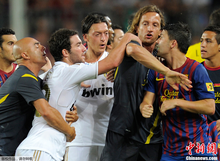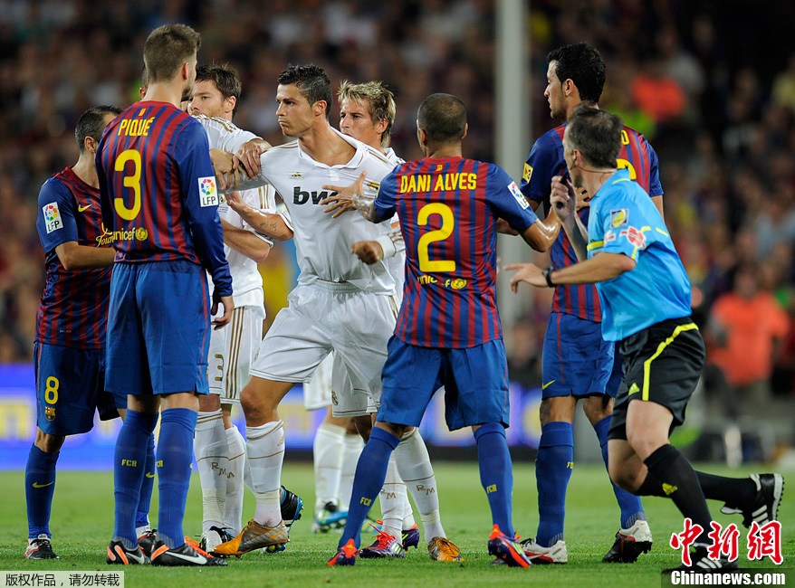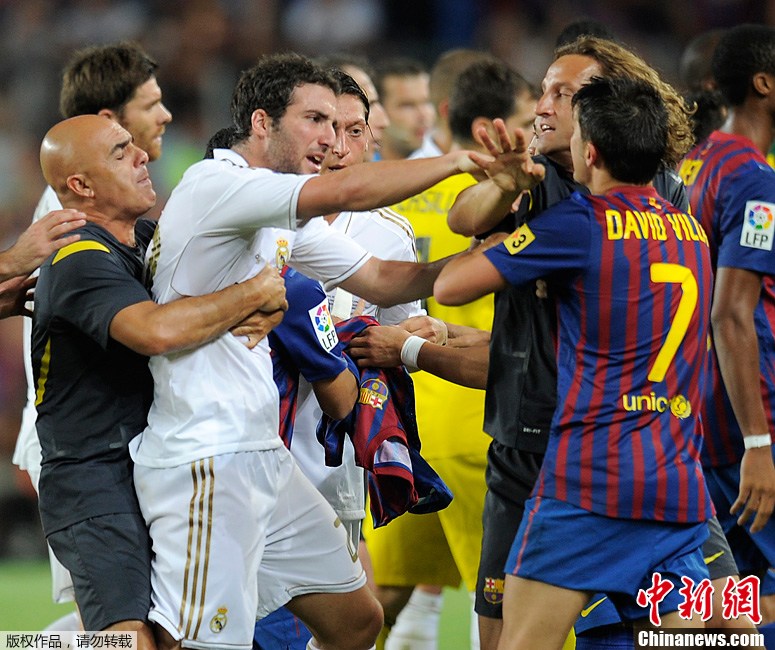 北京时间8月18日凌晨5点,2011年西班牙超级杯次回合比赛在诺坎普开战,巴萨主场迎战皇马。最终巴萨3-2战胜皇马,以总比分5-4卫冕西班牙超级杯。图为双方队员起冲突。
