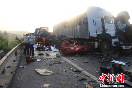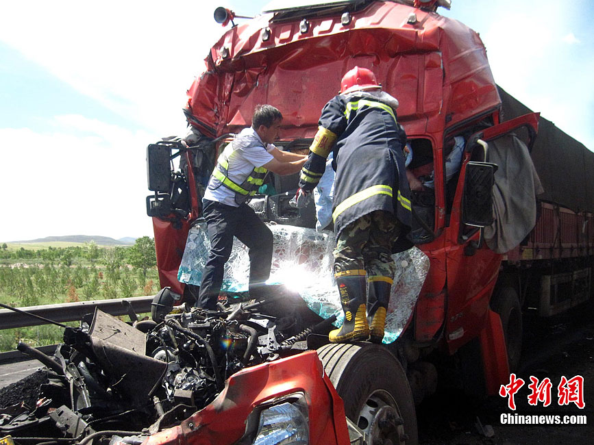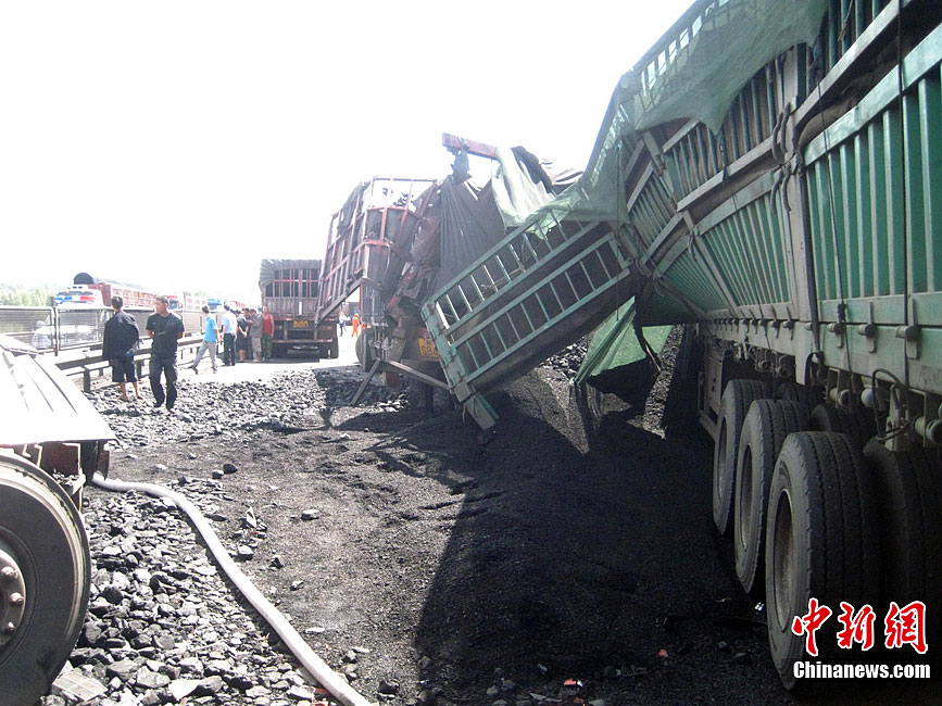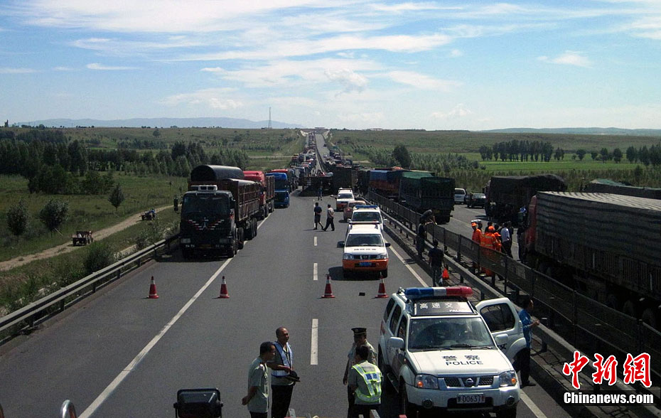 京藏高速内蒙古集宁段8月18日早晨发生30多辆货车连环相撞事故,目前已造成6死5伤。图为事发现场。中新社发 张龙里 摄