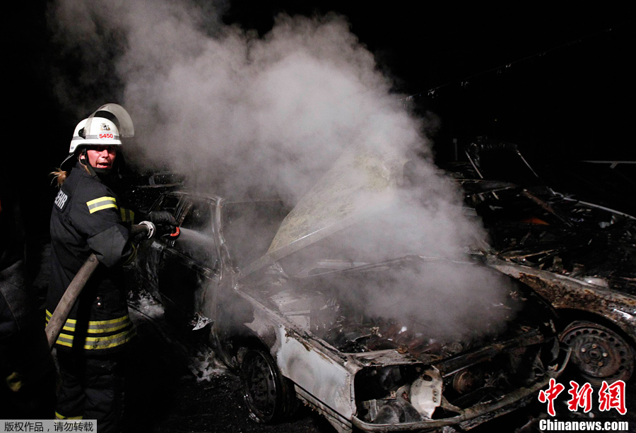 近日,警察德国柏林莎萝藤堡及附近地区连续几夜出现汽车被焚事件,三夜来已有35辆轿车被毁。柏林警方对此一筹莫展。图为8月19日,警察为被焚毁的轿车灭火。