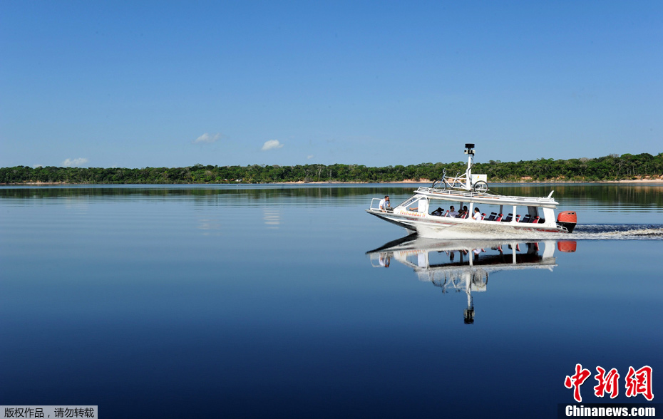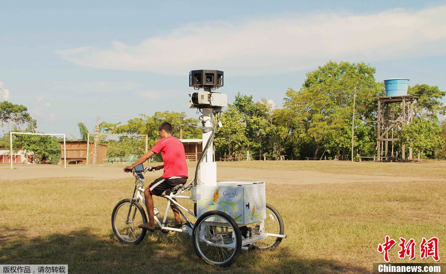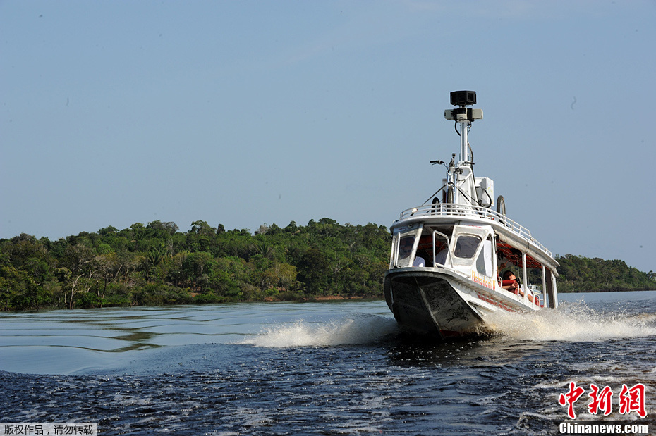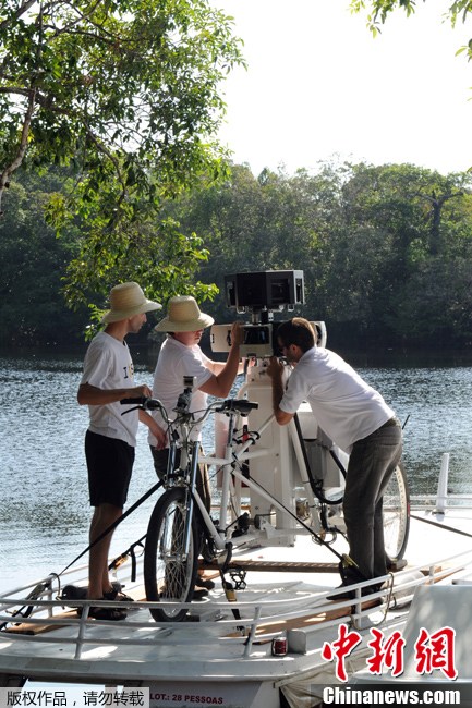 8月17日,在巴西亚马逊州,谷歌街景三轮车登上了一艘船,沿亚马逊河支流内格罗河顺流而下,对当地雨林和社区进行全景拍摄。谷歌此外还邀请当地居民骑上谷歌街景三轮车,在村庄和河岸边穿行拍摄图片。图为谷歌街景三轮车配备360度摄影机设备沿河拍摄。