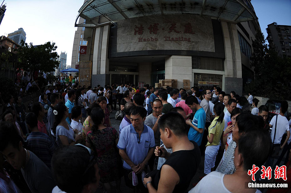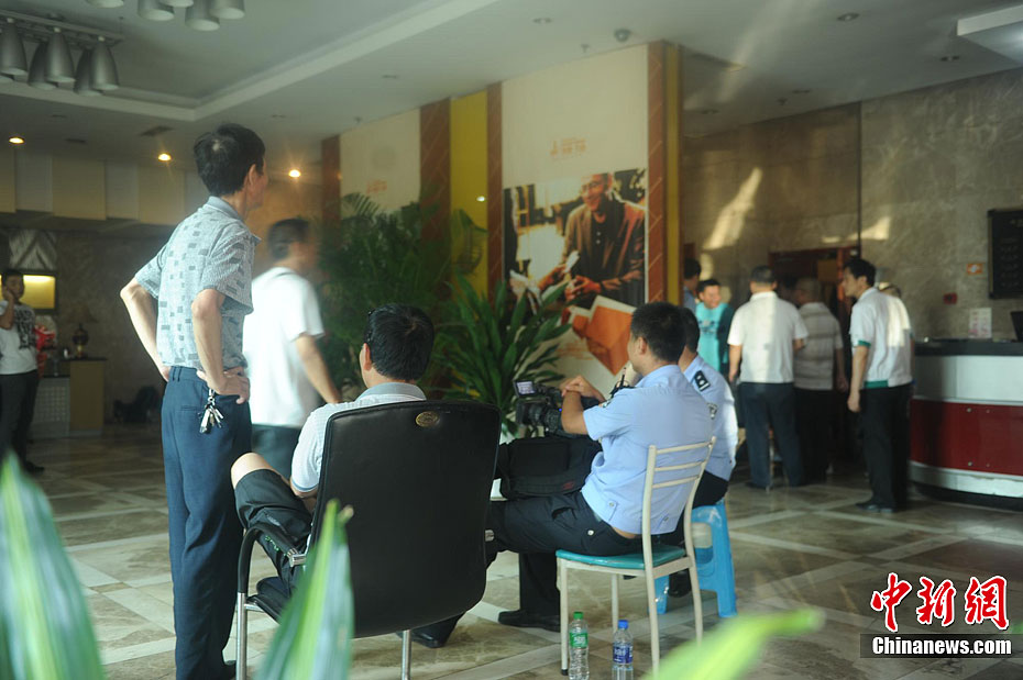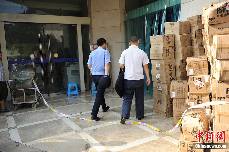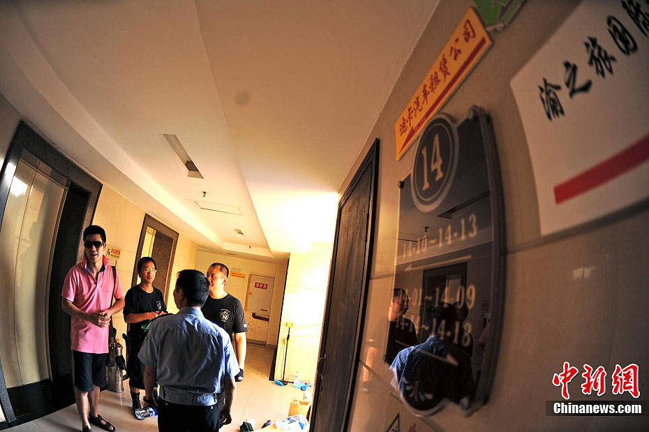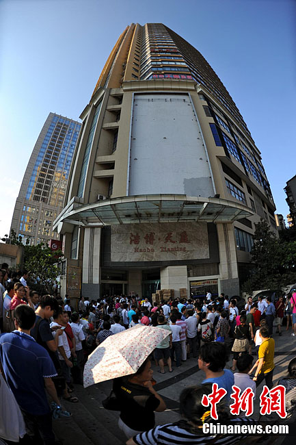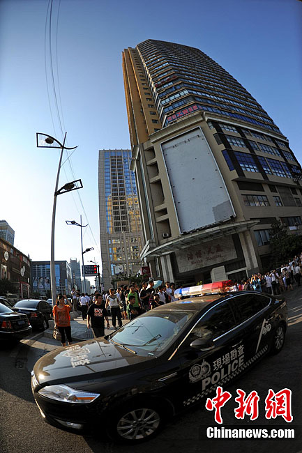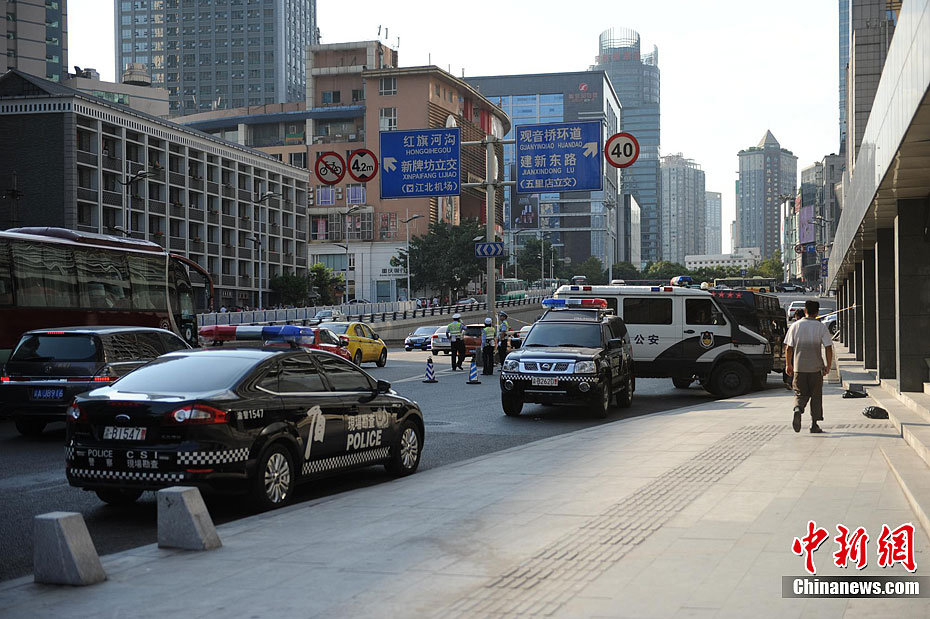 重庆警方通报,19日下午2时20分重庆市江北区观音桥某汽车租赁公司,发生一起入室抢劫案。犯罪嫌疑人抢劫后逃逸,现场无人员伤亡。目前警方正在全力侦办此案。记者赶赴事发地看到,警察已经封锁了该楼,不少市民顶着烈日在一旁围观。曹多然 摄