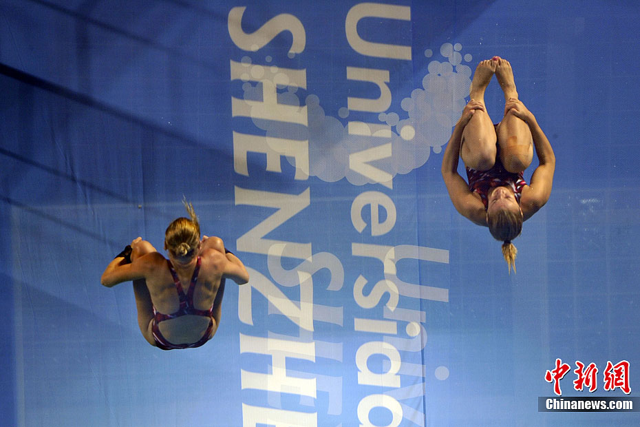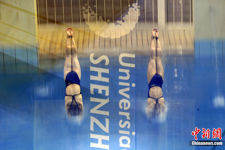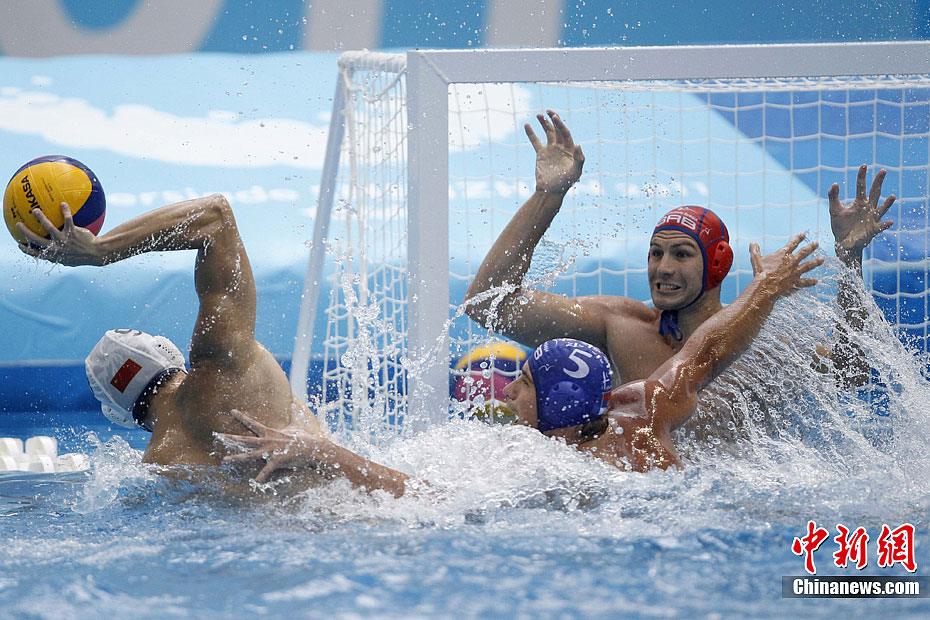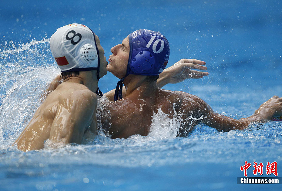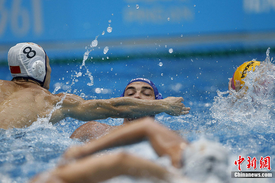 8月19日,第26届深圳世界大学生夏季运动会男子水球1/4决赛在深圳市宝安区游泳馆进行,中国3:14不敌塞尔维亚无缘半决赛。图为中国队8号陈景豪(左)与塞尔维亚队员在比赛中争抢。中新社发 盛佳鹏 摄