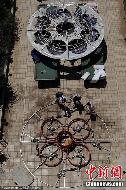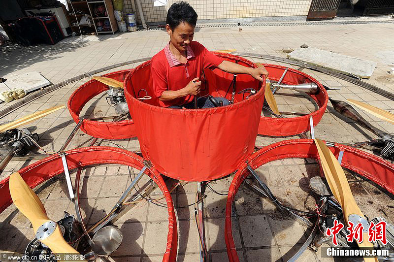 8月19日,武汉市江夏区流芳街流芳大道,农民舒满胜在家门前自制UFO飞碟。经过了一个多月的发明创造,该碟型飞行器基本完成。两次检测后,仍存在一些安全隐患。“再作进一步改良后将在近期试飞。”舒满胜满怀信心称。据了解,他去年曾自制试飞了2架飞机,试飞受伤痊愈后转而自制出了2台飞碟,而他这一系列行为的目的就是为了吸引公众注意力,从而宣传其办学理念。陈亮 摄 图片来源:CFP视觉中国