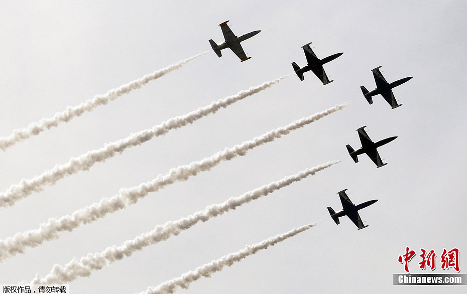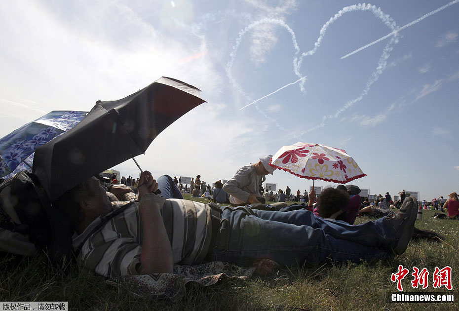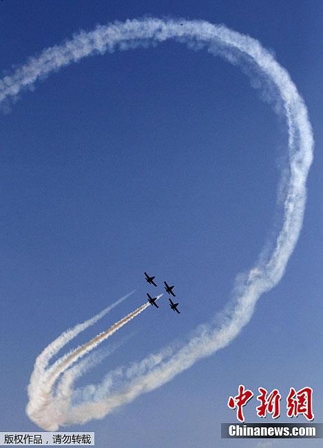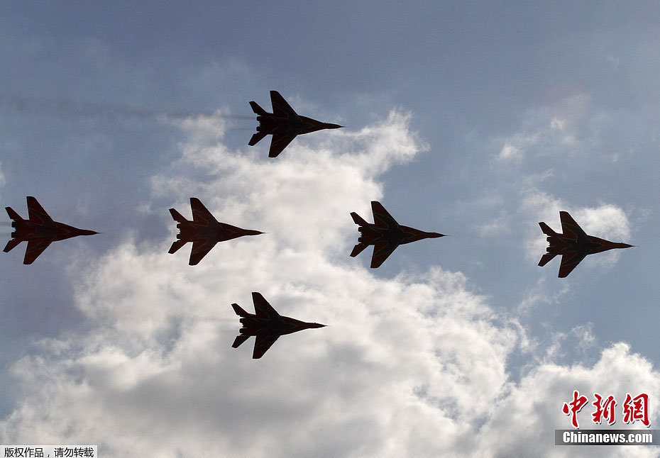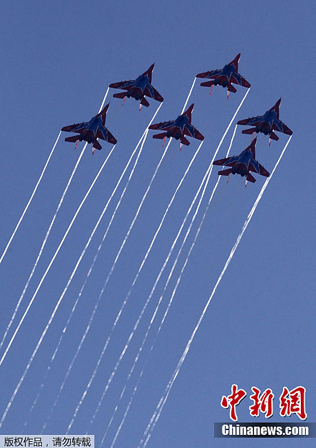 当地时间8月19日,2011年第十届俄罗斯国际航空航天展览会进入了为期3天的公众开放日,飞行员们为观众献上了一次次精彩的飞行表演。