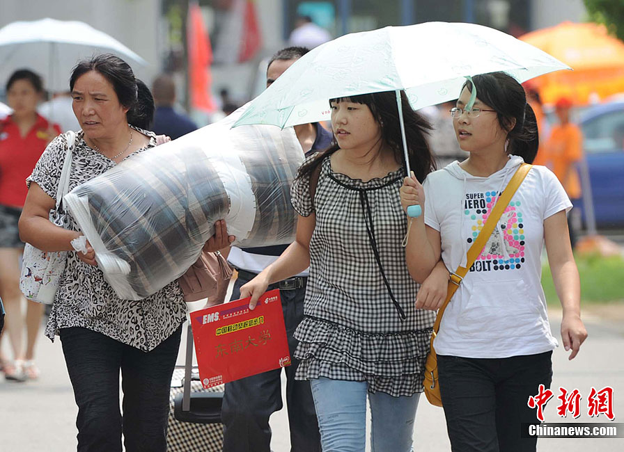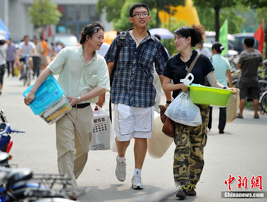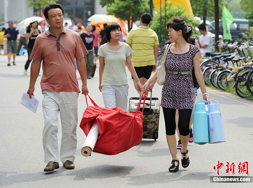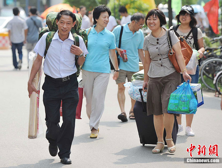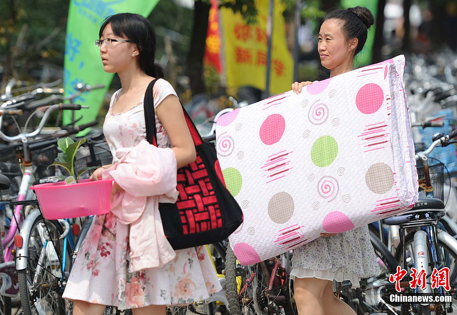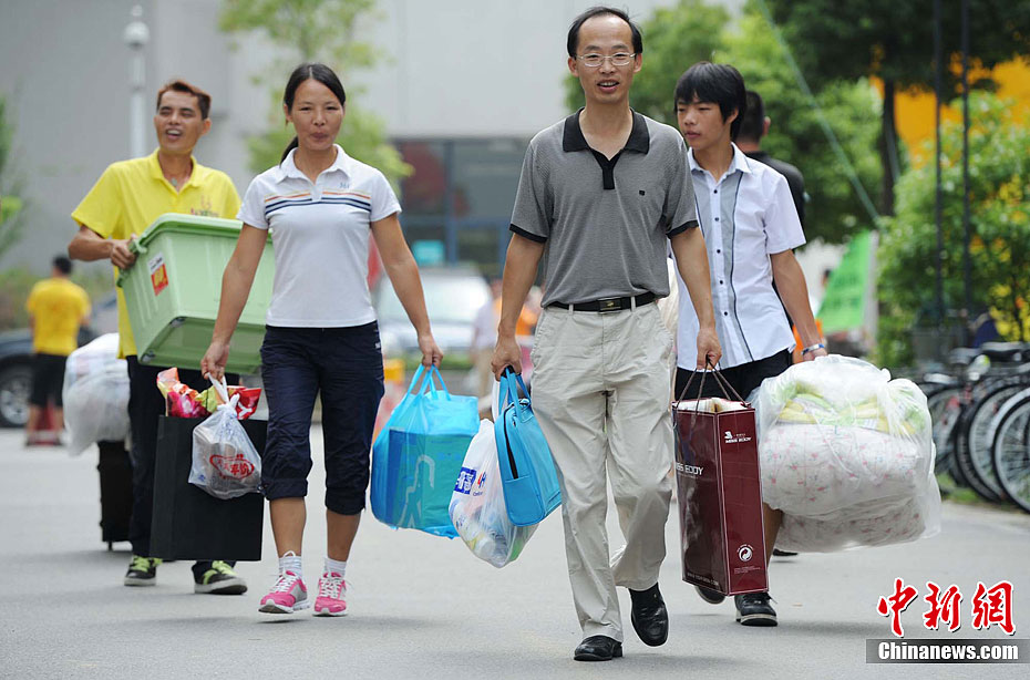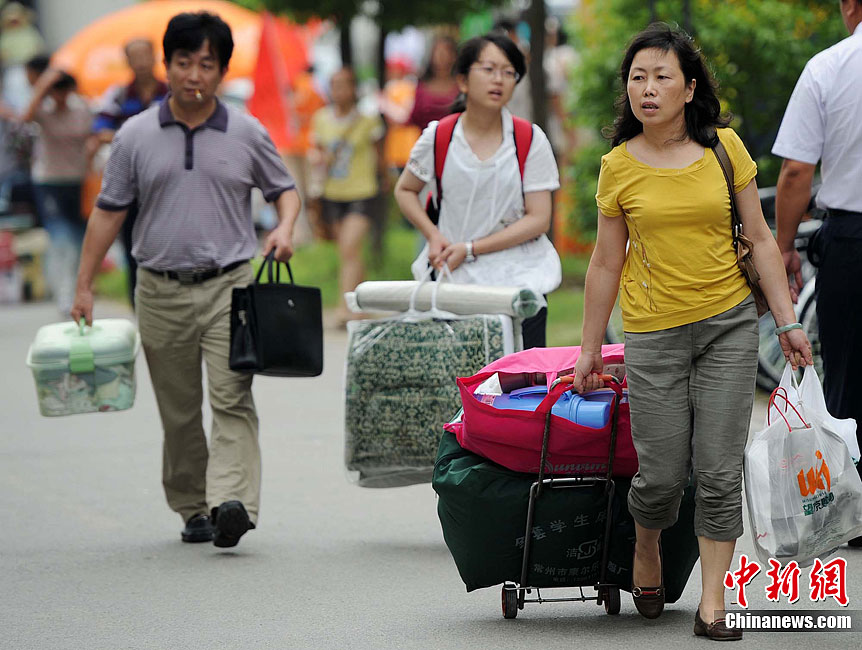 8月20日,南京东南大学迎来了首批“学生潮”。众多新生带着席子、被褥,电扇、手机、MP3乃至MP5、PSP、电脑前来报到。虽然学校和社会近年不断发出新生独自入学、培养独立能力的倡议,但家长对孩子考上大学的喜悦和执着的爱,让他们难却陪送的脚步,庞大的新生“亲友团”依然是大学校园迎新时节的一道风景。泱波 摄