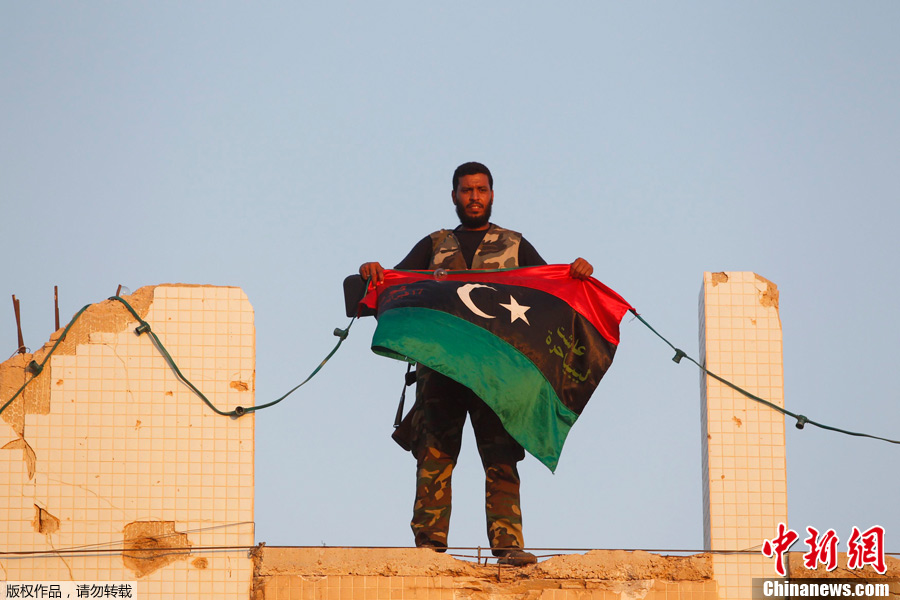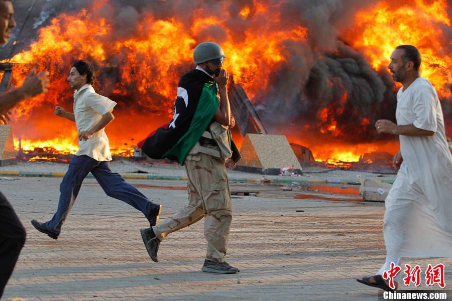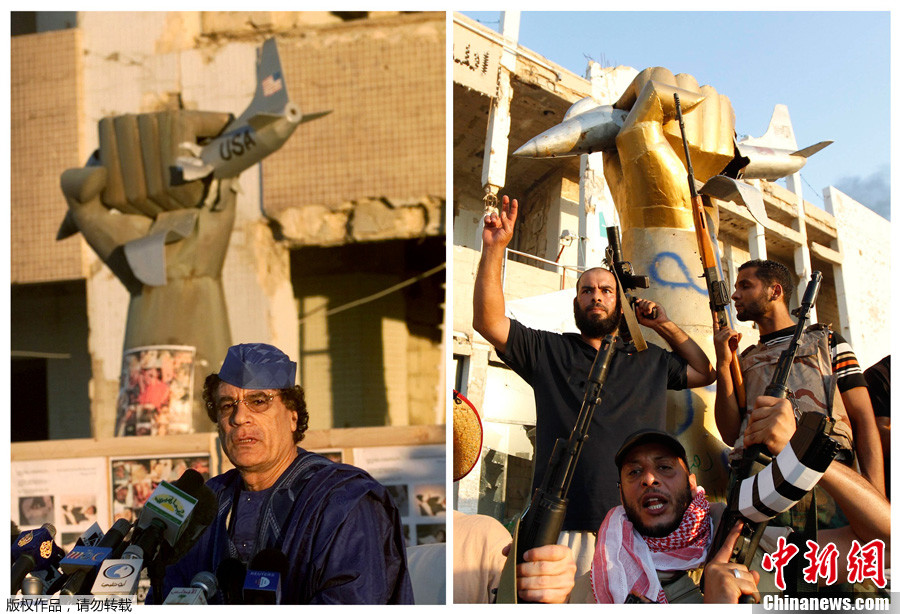 当地时间8月23日,利比亚首都的黎波里,反对派武装成功占领了象征卡扎菲政权的阿齐齐亚兵营。阿齐齐亚兵营是卡扎菲的指挥总部驻地,也是卡扎菲在的黎波里的主要住所之一。图为反对派士兵在阿齐齐亚兵营内“铁拳捏碎美国飞机”的著名雕塑前庆祝。